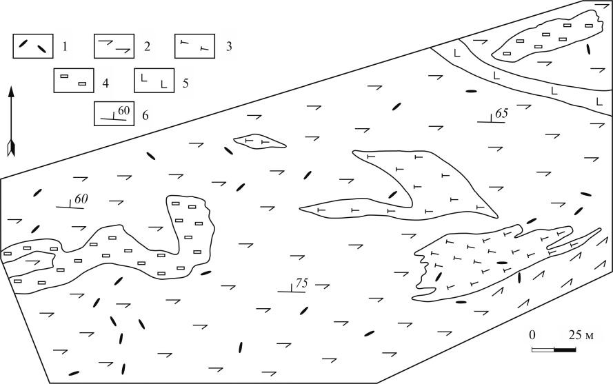 Фиг. 3. Геологический план Черногорского месторождения. 1 – линзы с ювелирным скаполитом; 2 – амфиболиты; 3 – альбититы, бедные темноцветными минералами; 4 – альбититы, обогащенные темноцветными минералами; 5 – гарцбургиты; 6 – элементы залегания.