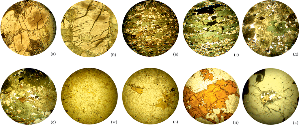 Фиг. 4. Фотографии шлифов пород (а–и) и минерала (к). а, б – гарцбургиты: кристаллы оливина на фоне хлоритовой зеленой массы. в–е – амфиболиты: в – вытянутые кристаллы амфибола (основа) с вкрапленностью олигоклаза, флогопита и рудного; г – то же, более крупнозернистое; д, е – порфиробластовые зерна амфибола на фоне более мелких его кристаллов, флогопита, олигоклаза и рудных. ж–и – альбититы: ж – равномерно зернистая масса альбита с вкраплениями флогопита, сфена, карбонатов, рутила; з – то же с крупными порфиробластами флогопита; и – то же, с очень крупными порфиробластами сфена. к – поперечный разрез под небольшим углом кристалла скаполита с включением олигоклаза и кальцита. Диаметр снимков а, в–к составляет 5 мм, объектив ×2.5; снимок (б) имеет диаметр 1.5 мм, объектив – ×10.
