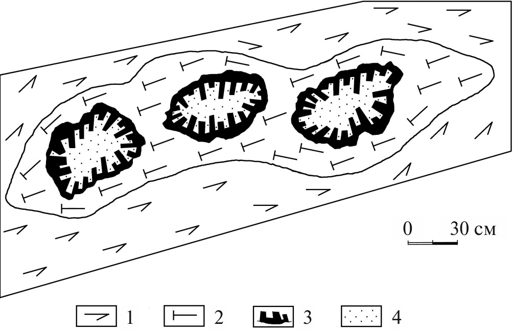 Площадь месторождения составляет 360 × 110–180 метров (фиг. 3). Вмещающие породы представлены двумя типами, имеющими субширотное простирание с падением на север под углами 60°–75°. Мы их разделяем по цвету на темные и светлые.