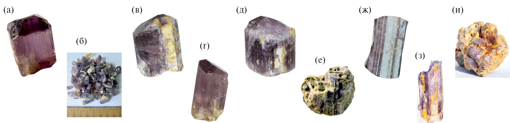 Фиг. 6. Скаполиты с Черногоского месторождения: а, в, г, д – характерные формы кристаллов размером от 2 до 5 см в поперечнике; б – товарное кристаллосырье; ж – продольная штриховка и поперечные “бороздки” растворения; з – поздний кальцит на поверхности грани; е, и – фрагменты стенок полостей, около 10 см в поперечнике.