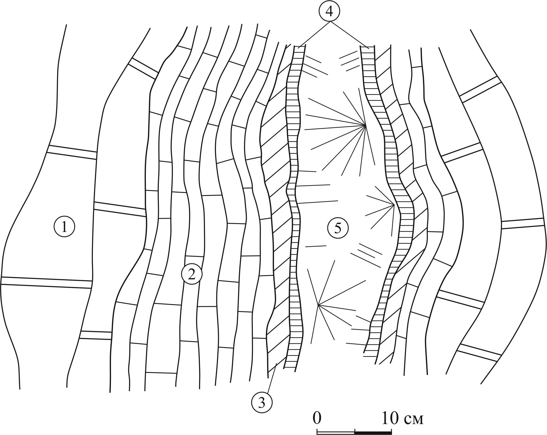 Фиг. 7. Зональная жила в мраморах. 1 – доломитовый мрамор; 2 – кальцифир с форстеритом; 3–5 – метасоматические зоны: 3 – диопсидовая, 4 – флогопитовая, 5 – шестоватого скаполита.
