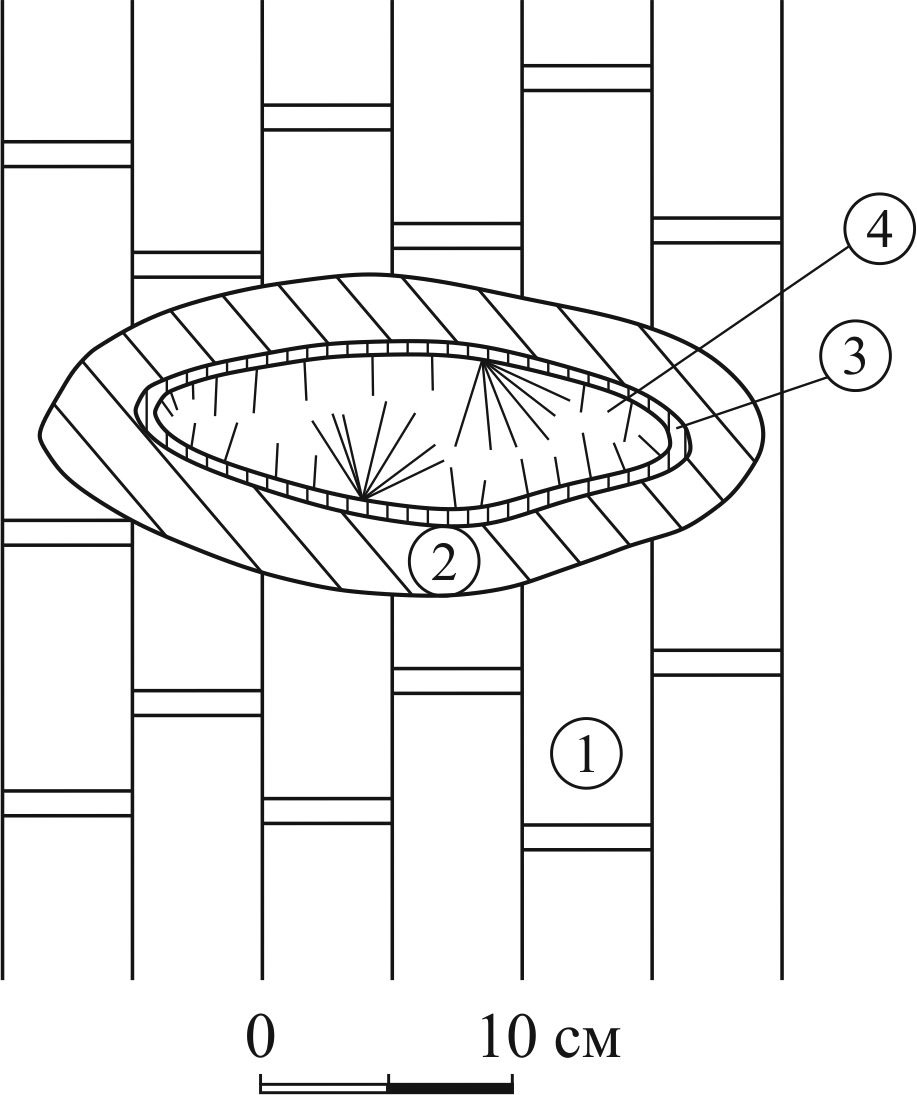 Фиг. 8. Зональная жила в мраморах (поперечное сечение). 1 – доломитовый мрамор; 2–4 – метасоматические зоны: 2 – диопсидовая, 3 – флогопитовая, 4 – шестоватого скаполита.