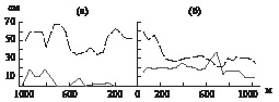 Фиг. 1. Средние мощности кварцевой (сплошная линия) и карбонатной (пунктир) составляющих в крупных жилах, пересекающих породы основного (а) и кислого (б) составов. По горизонтали указано расстояние от контакта пород, по вертикали – мощность соответствующей минерализации.