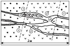 Фиг. 2. Распределение кварца и карбоната в мелких прожилках. 1 – кварц-слюдистые сланцы; 2 – амфиболовые сланцы; 3 – кварц; 4 – карбонат.