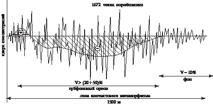 Фиг. 3. Результаты массового опробования вмещающих пород месторождения, вынесенные на профиль, перпендикулярный кровле гранита. V – коэффициент вариации V = (σ/хср) • 100%.