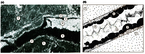 Фиг. 4. Строение кварц- настуран-кальцитовых (kku) жил. а – фотография жилы, б – схематический рисунок. 1 – порода, 2 – гребенчатый кварц, 3 – настуран, 4 – кальцит.