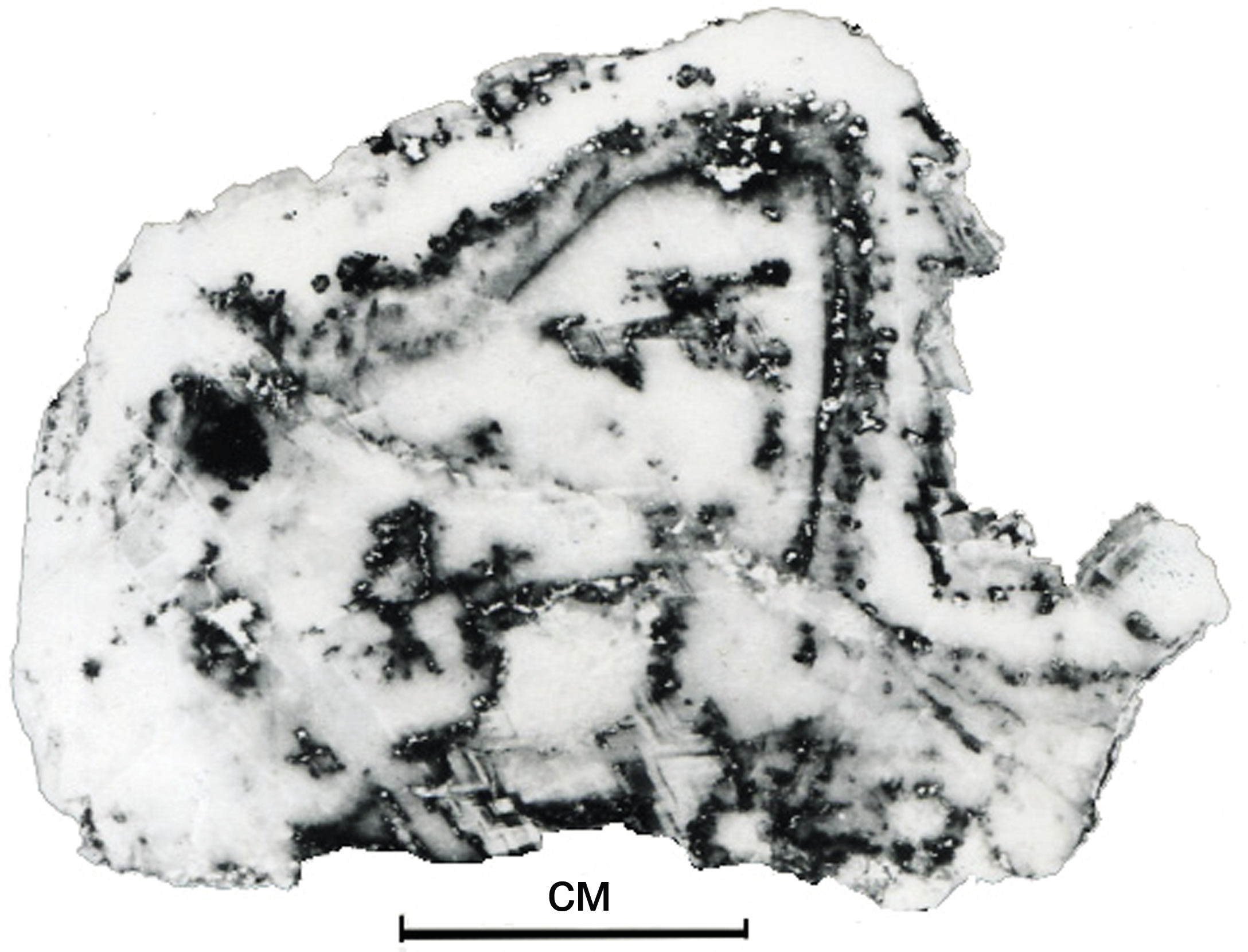 Фиг. 5. Скаленоэдр кальцита, замещенный доломитом (в разрезе). Темное – пустоты, выполненные гематитом, сульфидами, сульфосолями, мышьяком и др.