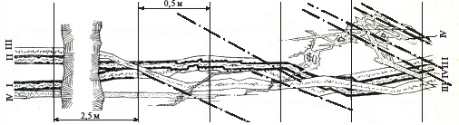 Фиг. 6. Взаимные пересечения четырех kku-жил. Римскими цифрами обозначены разновозрастные жилы одной стадии в порядке их образования. Зарисовка кровли, гор. 990 (По Барсукову Викт. Л. и др., 1991).