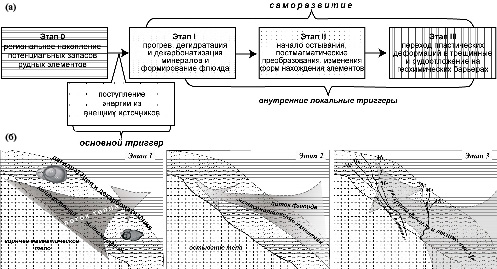 Длительный и сложный процесс последовательной стадийной смены минеральных жил не начинается с нуля, а наследует особенности предшествующего геолого-геохимического развития конкретных территорий (Рундквист, 1983). Процесс формирования рудных провинций (Тугаринов, 1963) может намного опережать само рудообразование, долгое время находясь в латентном состоянии (Наумов и др., 1983), пока естественный триггер (Наумов, 2015) не запустит процесс саморазвития. Основным триггером (Наумов, 2015; Наумов, Миронова, 2017), запускающим всю систему формирования месторождения Шлема, явилось внедрение гранитного массива, внесшего в сложившуюся геологическую систему мощный энергетический импульс, запустивший все дальнейшие процессы саморазвития. Схематически весь этот комплекс рудоподготовительных и рудоконцентрирующих явлений, с учетом материалов предыдущих статей, изображен на фиг. 7.