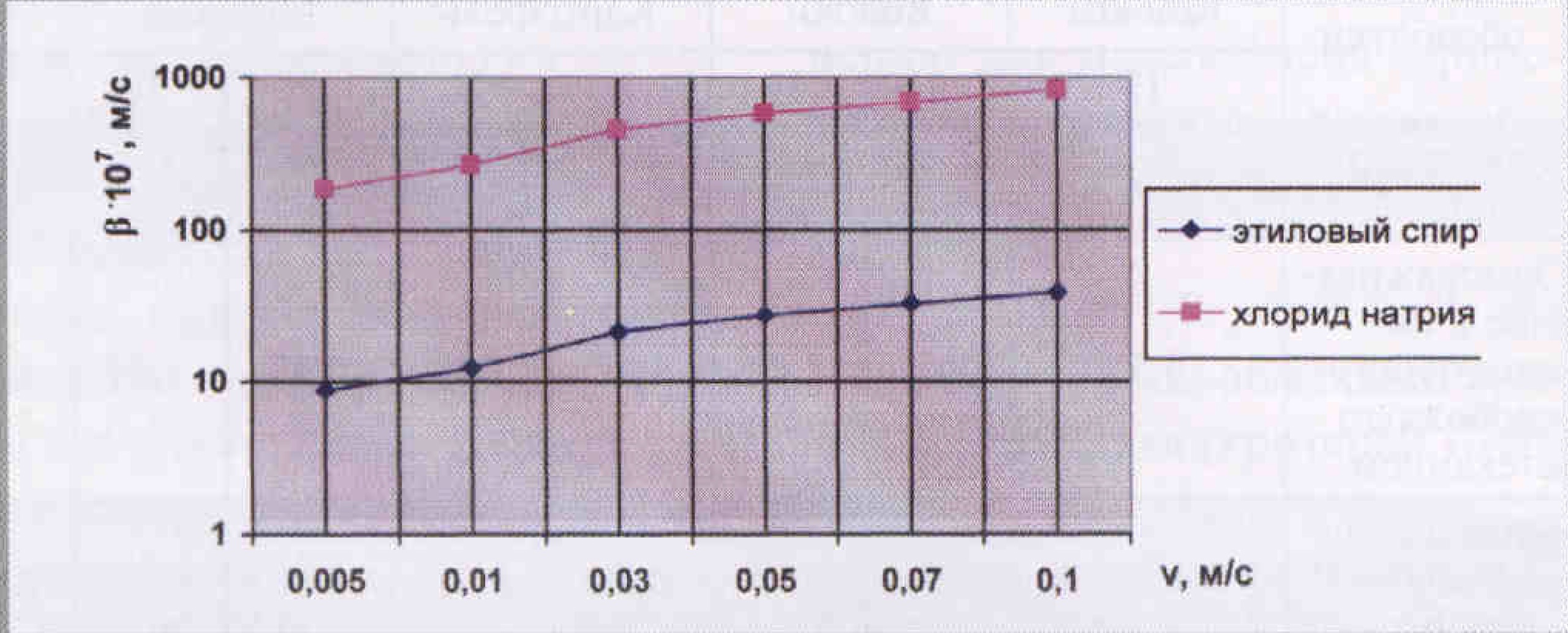 На рисунке приведены зависимости коэффициентов массоотдачи этилового спирта и хлорида натрия от скорости движения хладоносителя, рассчитанные по уравнению (4).