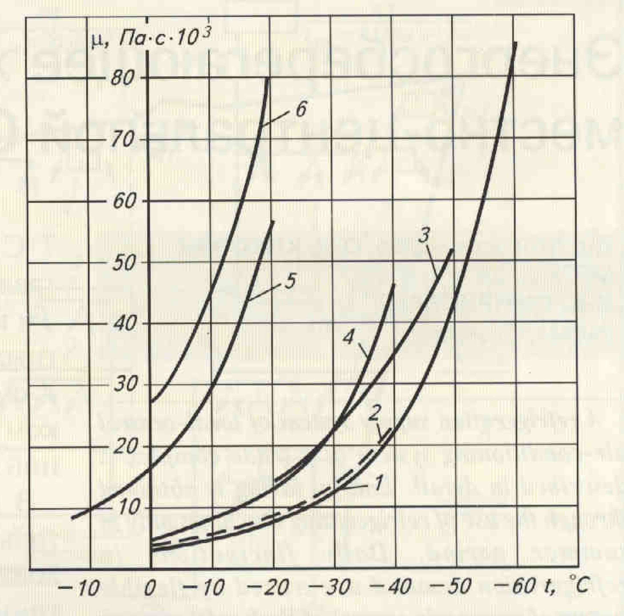 Зависимость динамической вязкости ц низкотемпературных хладоносителей от температуры t:1 Экофрост 60; 2 фризиум (концентрация 47 %, температура замерзания -55°С); 3 — раствор хлорида кальция (концентрация 29,9 %, температура замерзания —55 °C); 4 — Экофрост 40; 5 — Экосол 40;6 — пропиленгликоль