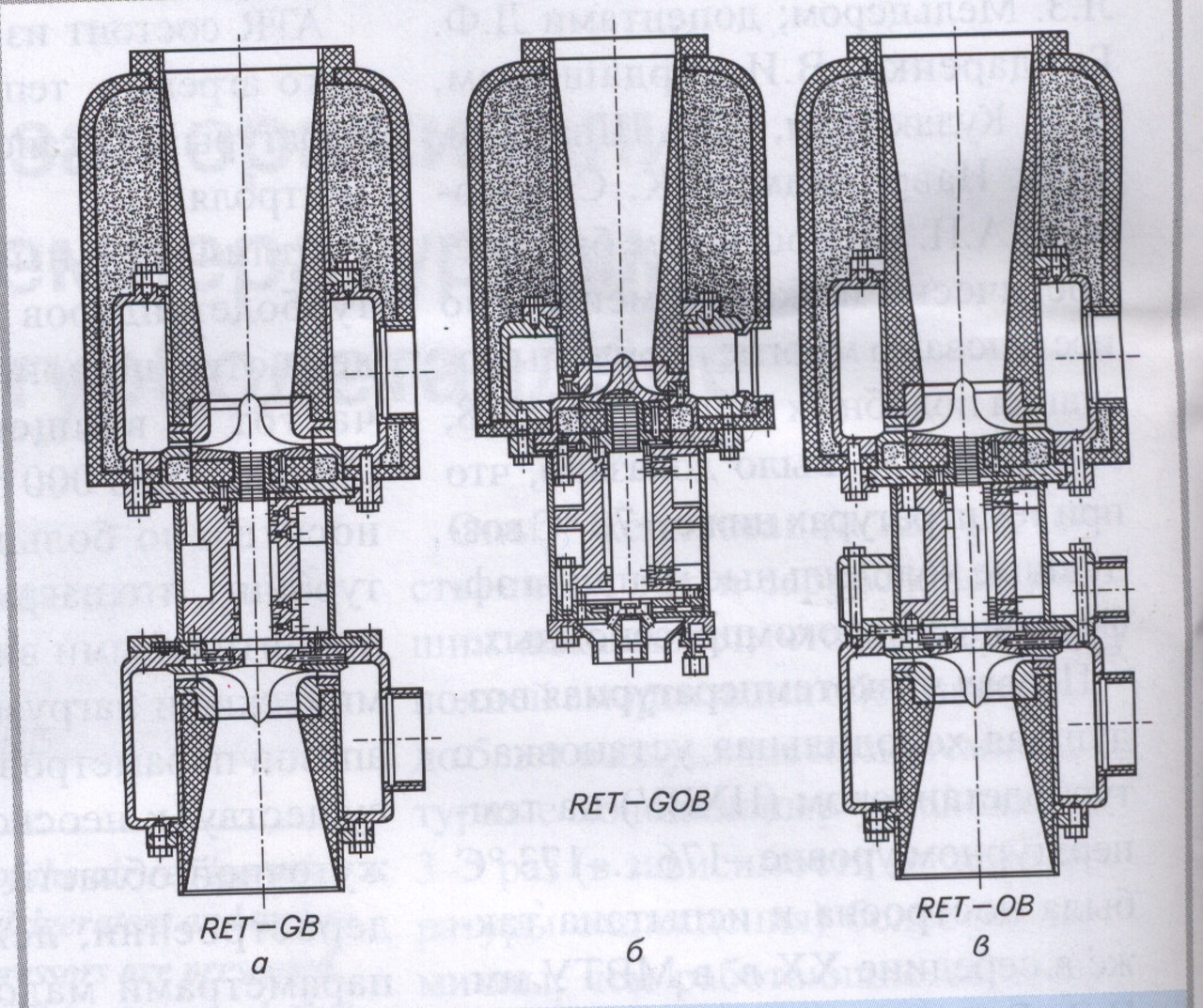 Рис. 1. Базовые конструкции турбодетандеров серии RET: а — турбодетандер с газостатическими подшипниками (RET-GB); б — турбодетандеры для температур ниже —80 °C с комбинацией газостатического и гидростатического подшипников (RET-GOB); в — турбодетандеры с гидростатическими подшипниками (RET-О В)