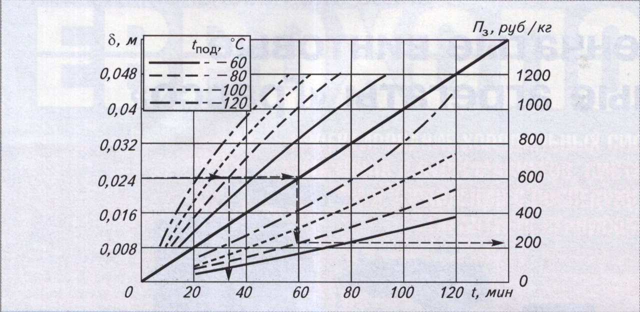 На базе полученных данных построены номограммы, одна из которых для продукта класса Пср при стоимости электроэнергии 1,0 руб/(кВт-ч) представлена на рис. 4. Показан пример использования номограммы: задаваясь толщиной продукта 8 и температурой подаваемого воздуха Z , можно определить продолжительность процесса т и величину приведенных затрат П3 на замораживание.