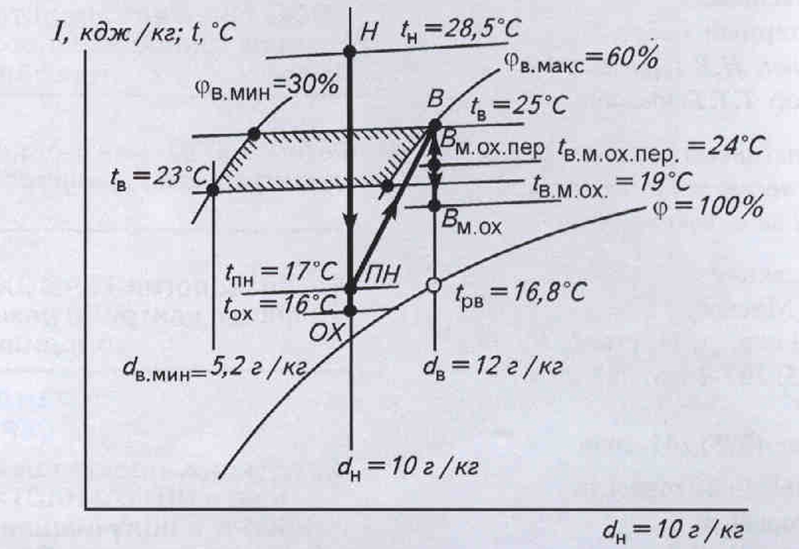 Приточный наружный воздух с параметрами Б (точка Н) [3] охлаждается при постоянном влагосодержании до tm = 16 °C. В приточном вентиляторе и воздуховодах он нагревается на 1 °C и с температурой tпн = 17 °C через диффузоры под потолком (ниже светильников) равномерно подается струями в обслуживаемую зону торгового помещения. Вытяжка отработанного воздуха из каждого торгового помещения осуществляется из верхней зоны через заборные устройства, смонтированные выше светильников. Это позволяет до 40 % теплоты от светильников отводить с вытяжным воздухом.
