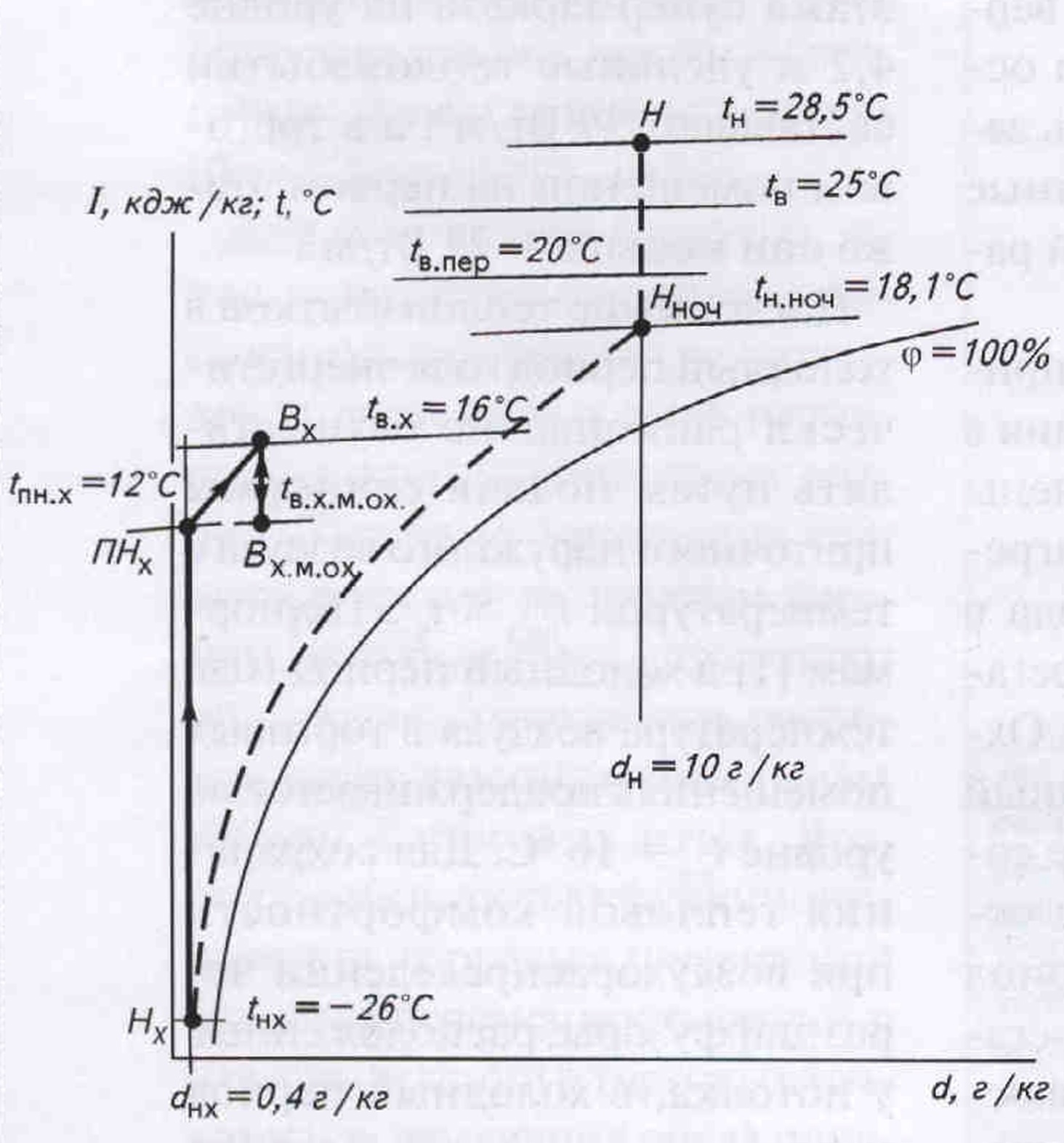 Построение на I-d диаграмме расчетного режима работы местно-центральной СКВ торговых помещений в холодный период года представлено на рис. 2.