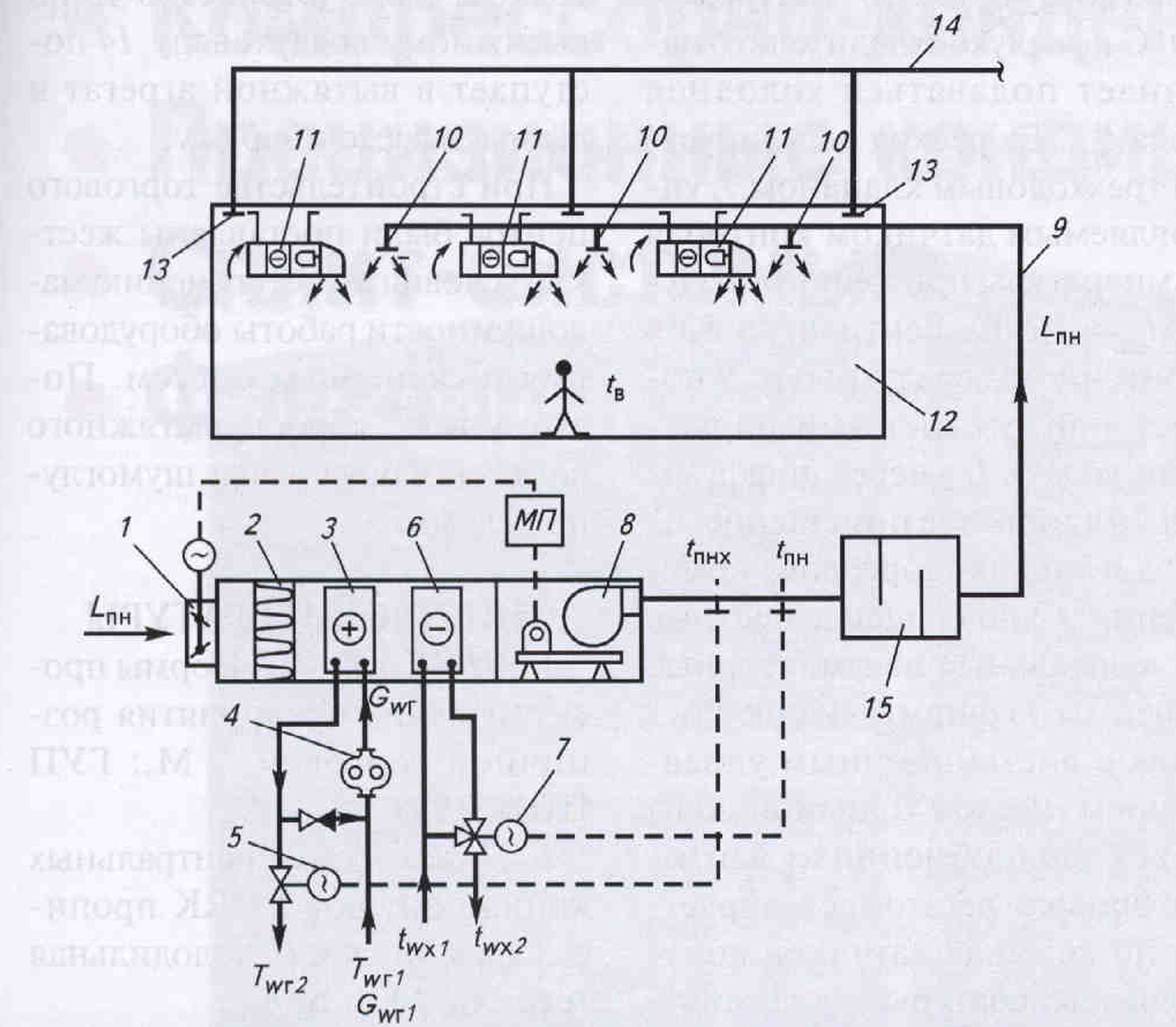 Рис. 3. Принципиальная схема местно-центральной СКВ, обслуживающей торговое помещение:1 — клапан поступления саннормы приточного наружного воздуха Lпн; 2 — фильтр; 3 — калорифер; 4 — сдвоенный рециркуляционный насос; 5 — автоматический водяной клапан на трубопроводе горячей воды; 6 — воздухоохладитель; 7 — автоматический трехходовой клапан на трубопроводе холодной воды; 8 приточный вентилятор; 9 — приточный воздуховод; 10— приточные диффузоры; 11 — местные вентиляторные воздухоохладители; 12 — торговое помещение; 13 — заборные вытяжные устройства, 14 — вытяжной воздуховод к вытяжному агрегату (на схеме не показан); 15 шумоглушитель