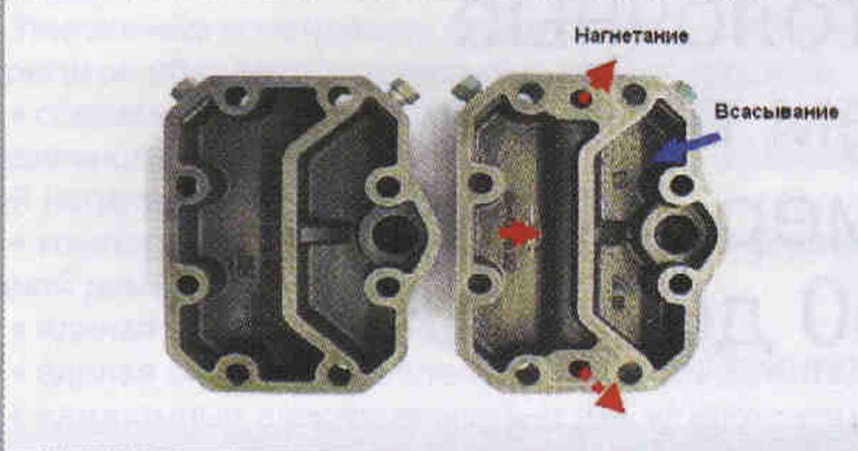 Несмотря на исключительную плавность хода, обусловленную конструкционными особенностями компрессоров этой серии, в отдельных случаях возникали значительные резонансные пульсации в нагнетательных трубопроводах. Как правило, такие пульсации сокращаются до приемлемой величины путем установки глушителей (демпферов) на трубопроводе. Недостаток такого технического решения состоит в том, что на участке нагнетательного трубопровода между демпфером и компрессором всегда присутствуют значительные пульсации. Полностью избежать негативного воздействия пульсаций давления в системе удалось благодаря новой головке блока цилиндров (рис. 1), где с помощью резонансного канала пульсации гасятся в месте их возникновения.