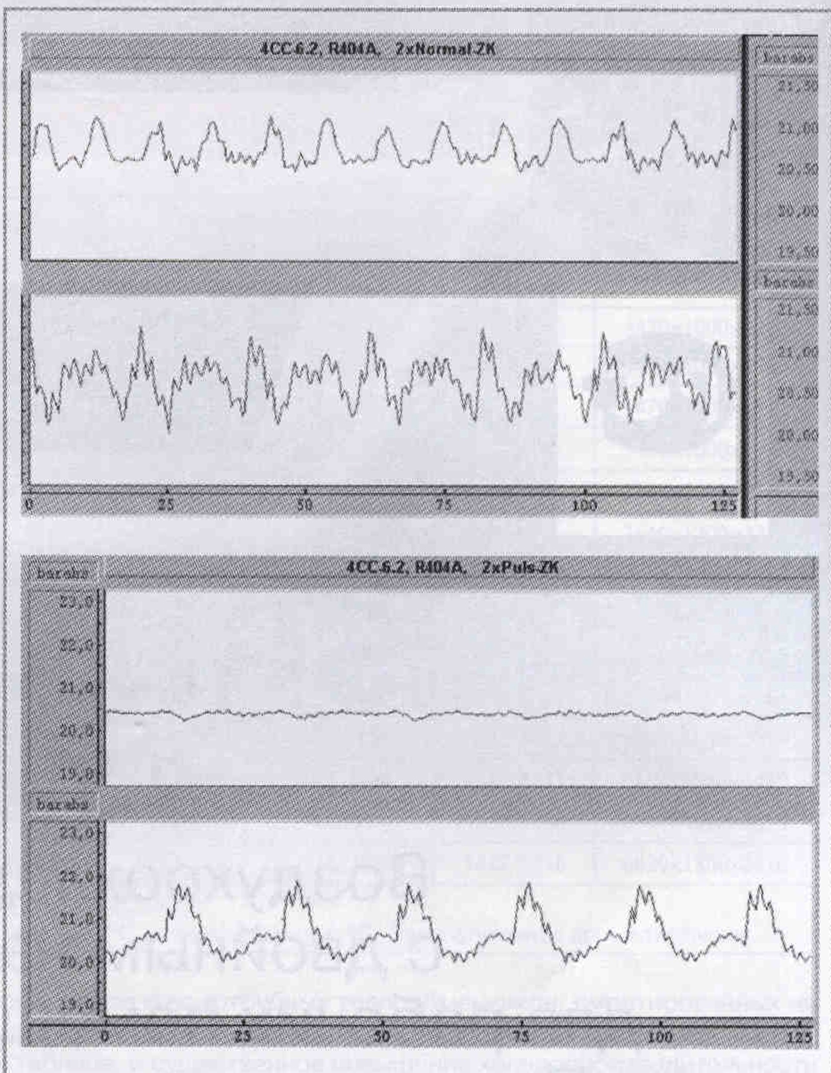 Сравнение характера пульсаций при стандартной и модифицированной головках блока цилиндров показано на рис. 2.