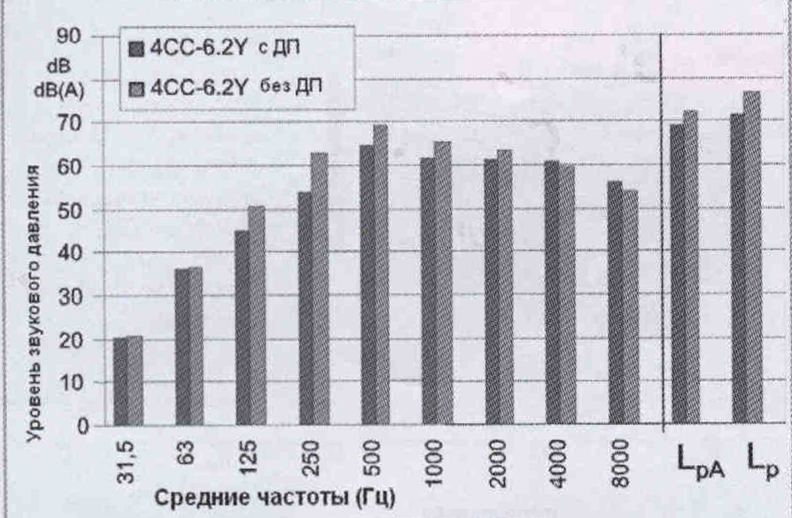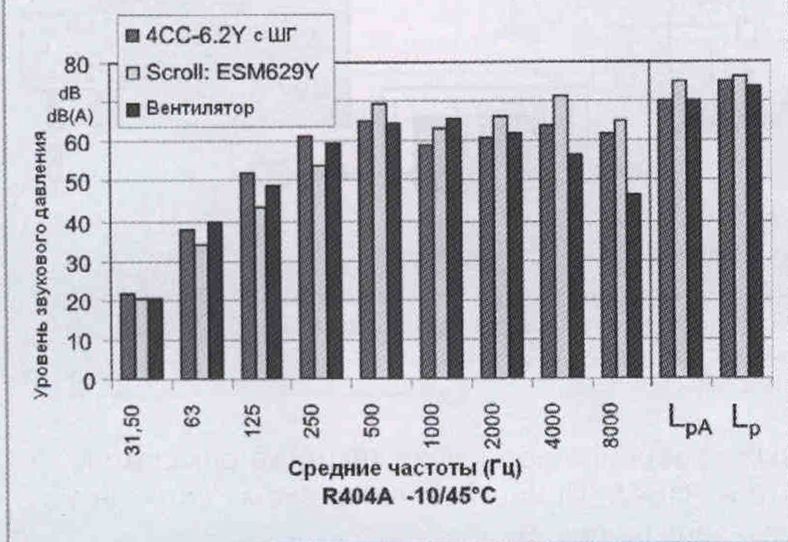 Рис. 4. Сравнение уровней звукового давления в машинном отделении на расстоянии 1 м для компрессора Octagon 4CC-6.2Y, спирального компрессора ESM629Y и вентилятора агрегата