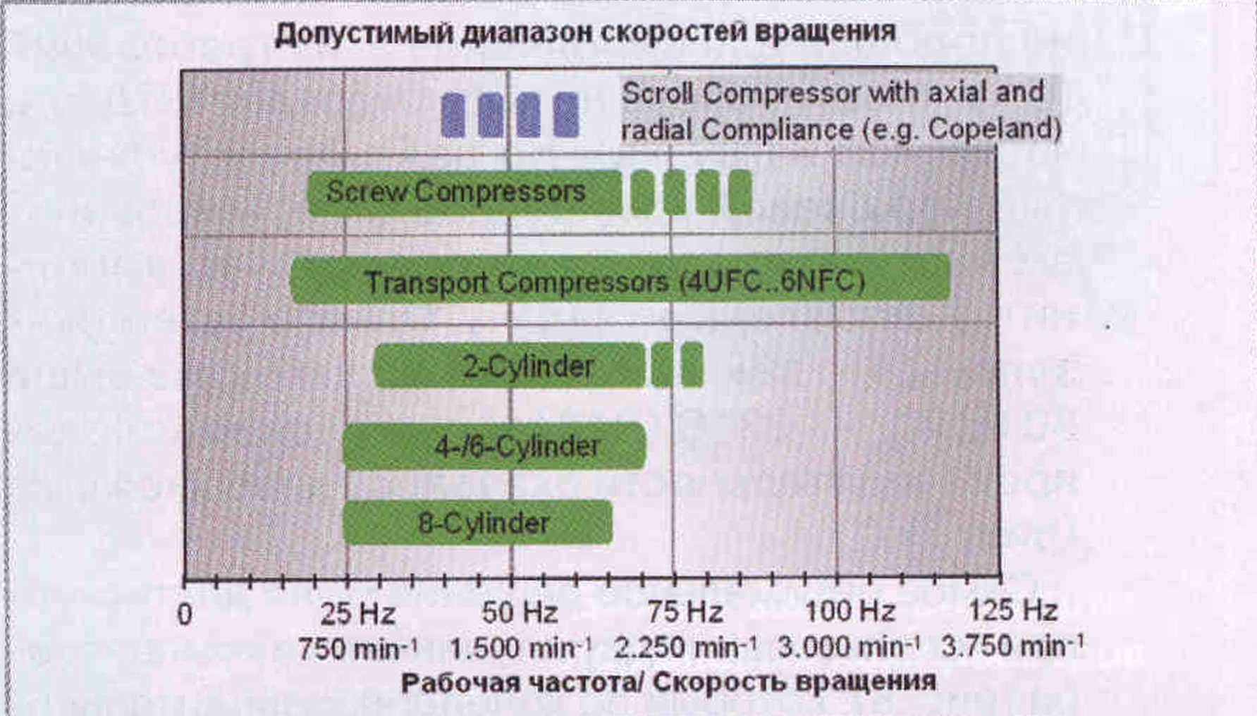 Объемная производительность короткоходовых поршневых компрессоров оптимально регулируется путем изменения частоты вращения коленчатого вала. Хорошим примером является серия компрессоров Octagon, допустимый диапазон частот питающего тока для которой 30...60 Гц (стандартное исполнение) и 20...70 Гц (расширенный вариант исполнения) (рис. 5).