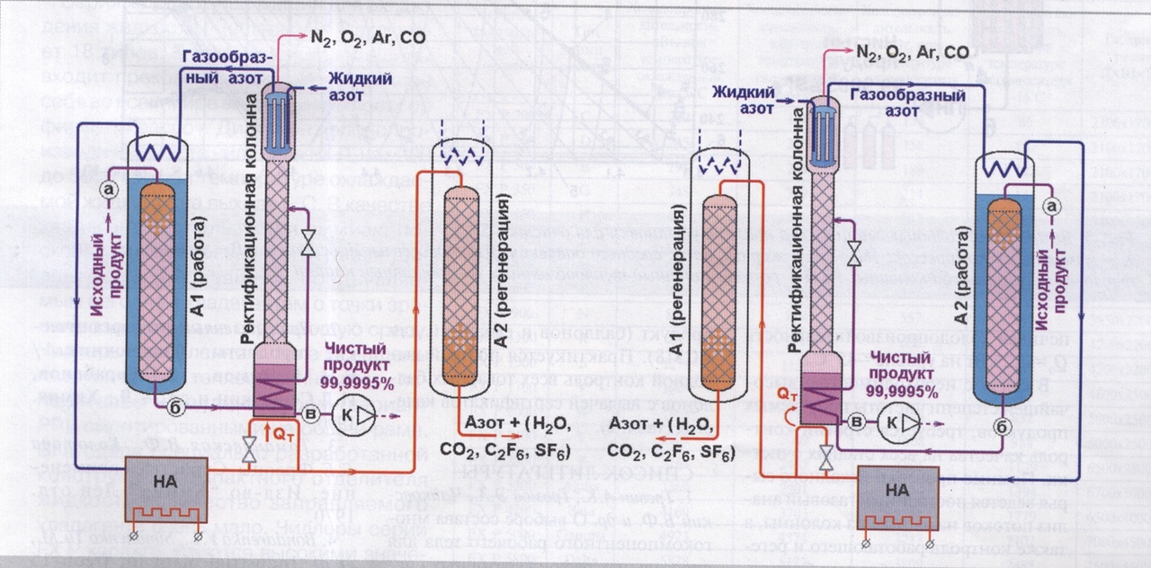 Экономия жидкого азота, выступающего в качестве хладагента и греющей среды при регенерации, достигается за счет его многократного использования. Сначала жидкий N2 подается в конденсатор ретификационной колонны (см. рис. 3). Далее парожидкостная смесь поступает в охладитель работающего адсорбера, откуда после испарения поток азота направляется в нагреватель НА. Нагретый до температуры около 420 К (147 °C) N2 используется для регенерации пассивного адсорбера, вымывая накопленные в нем фракции в атмосферу. При необходимости достигается утилизация поглощаемого из смеси гексафторэтана R116 (C2F6).