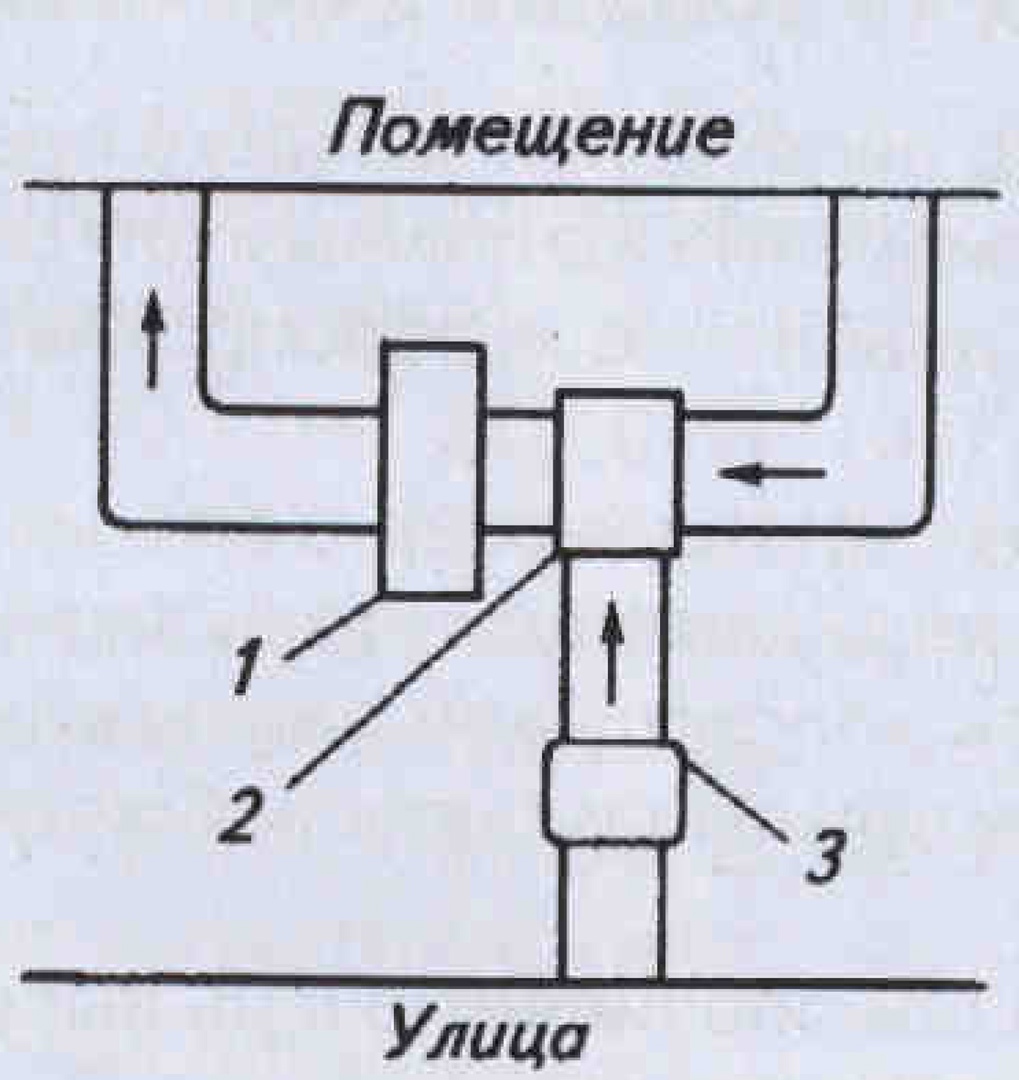 Рис. 2. Схема подачи воздуха: 1 — внутренний блок (теплообменник и вентилятор) 2 -камера смешения; 3 — канальный вентилятор
