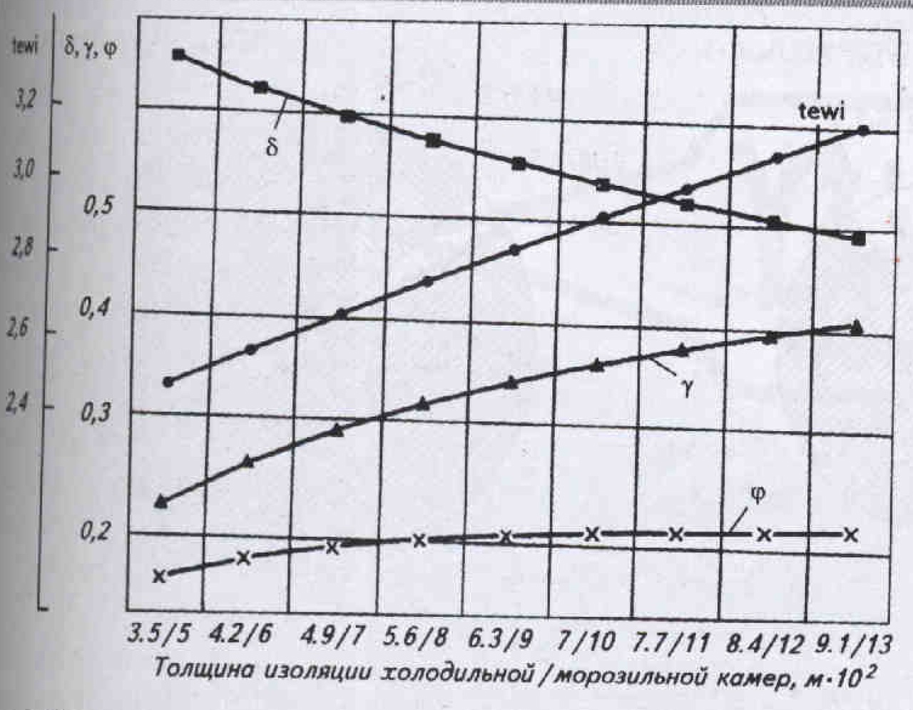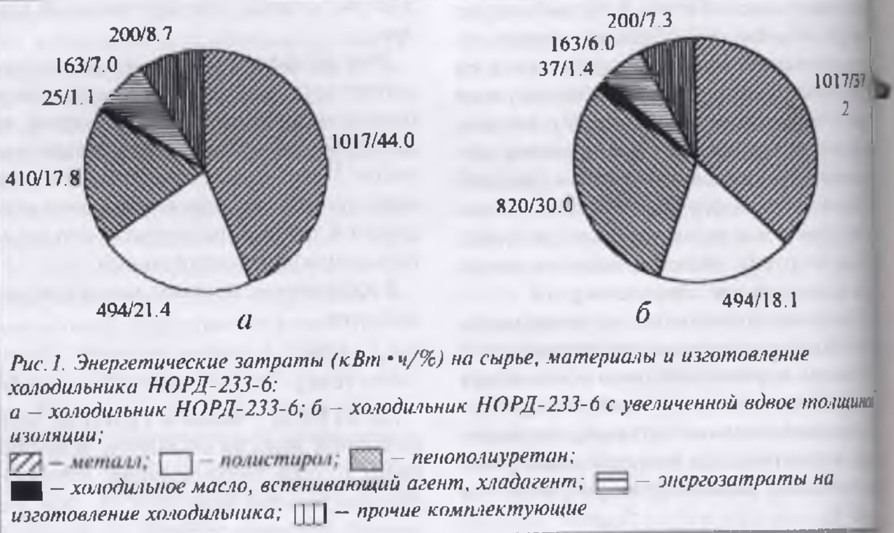 В работах, посвященных увеличению энергетической эффективности бытовой холодильной техники, высказывается широко распространенное мнение о значительном возрастании цены холодильника при увеличении толщины изоляции |2]. Однако более корректную информацию несет структура энергетических затрат, рассчитанная через энергетические эквиваленты [3].