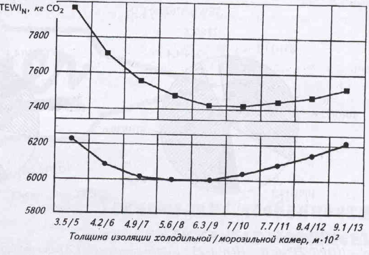 Все эколого-термоэкономические коэффициенты тесно связаны между собойi рамках единой структуры TEWIN [4]. По этому чем толще изоляции, тем меньше теплопритоки внутрь холодильника и потребление энергии (TEWIp). Следовательно имеется тенденция к снижению TEWI. Вместе с тем с увеличением толщины изоляции возрастают затраты энергии на производство изоляционного материала, что приводит к повышению TEWIэ Нецелом TEWIN. Таким образом, с позиции эколого-термоэкономического анализа и при определенной толщине изоляции дальнейшее ее увеличение становится не целесообразным (рис. 3). Значительно больший эффект может иметь переход к применению заливочной изоляции с использованием изопентана, у которой коэффициент теплопроводности на 20-30 % ниже, чем у обычного пенополиуретана. Кроме того, уменьшение толщины стенок холодильника, где использована такая изоляция, позволит увеличить на 10 % ею полезный объем [2]. На сегодняшний день наиболее кардинальным методом уменьшения теплопритоков является использование дорогой, но очень эфективной изоляции, так называемой суперизоляции.