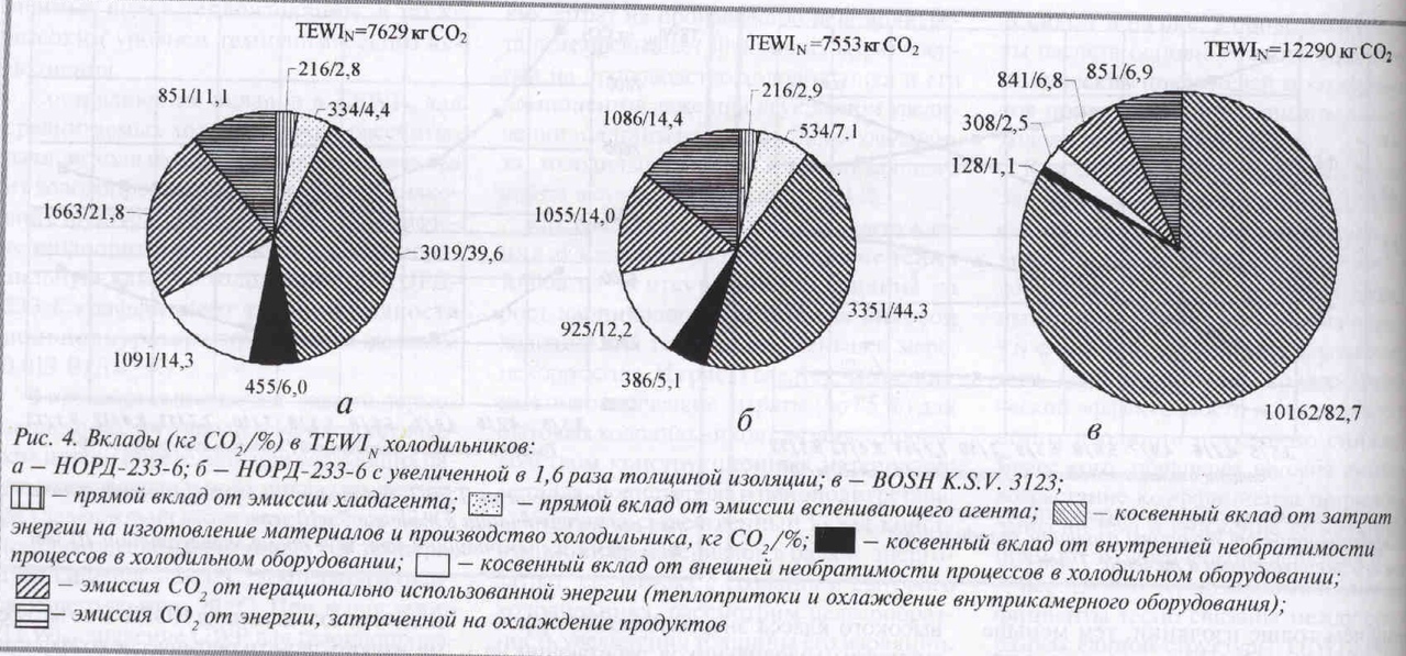 На рис. 4 представлены диаграммы, из которых следует, что суммарный вклад в TEWI V от эмиссии галоидопроизводных углеводородов (R134а и R141b) весьма незначителен. Напротив, энергетические затраты на создание конструкционных материалов и в целом холодильника велики.