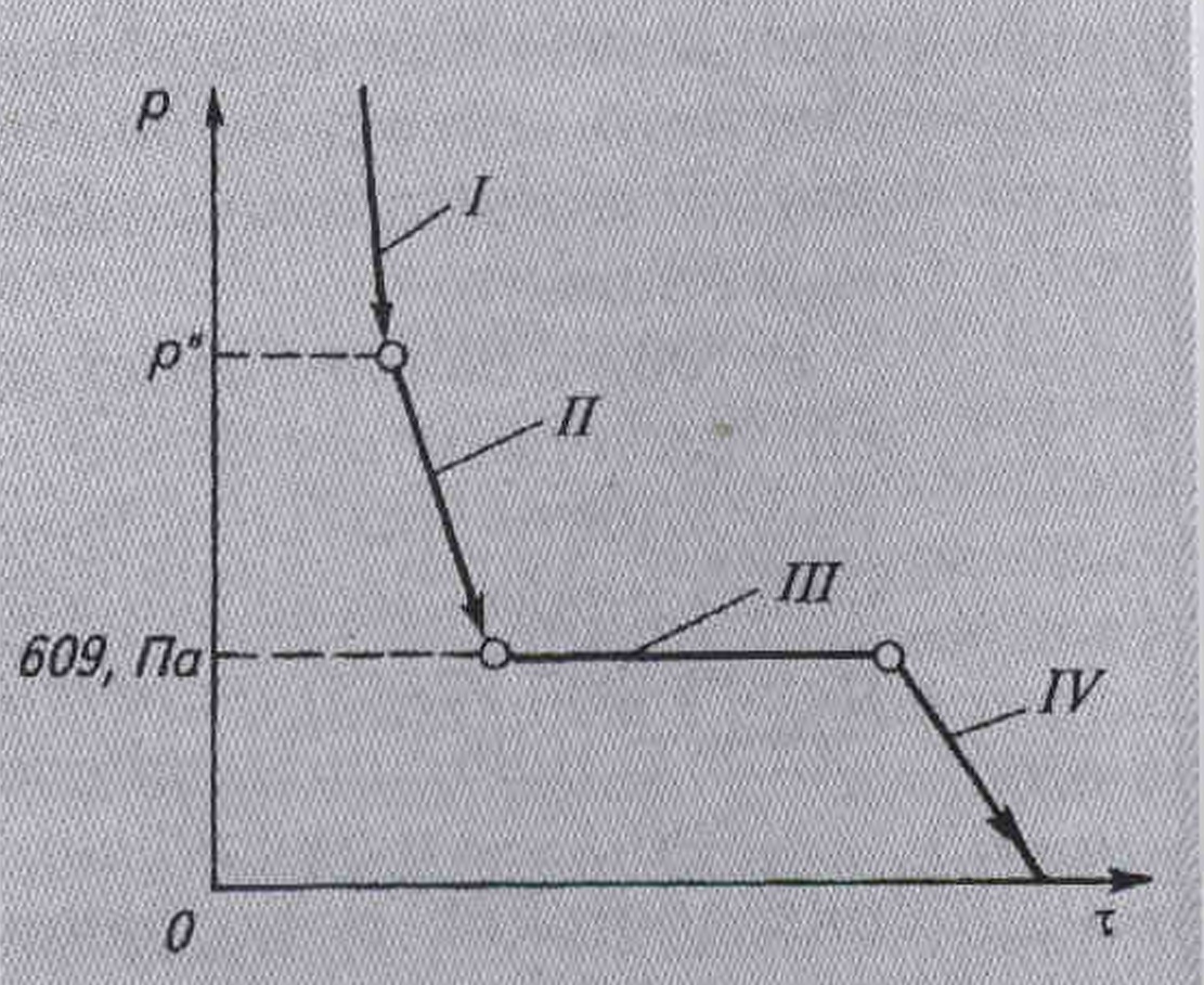 Рис.1 Различные стадии процесса вакуумной откачки и охлаждения жидкости, находящейся в герметичном резервуаре, при малой величине теплопритока из окружающей среды