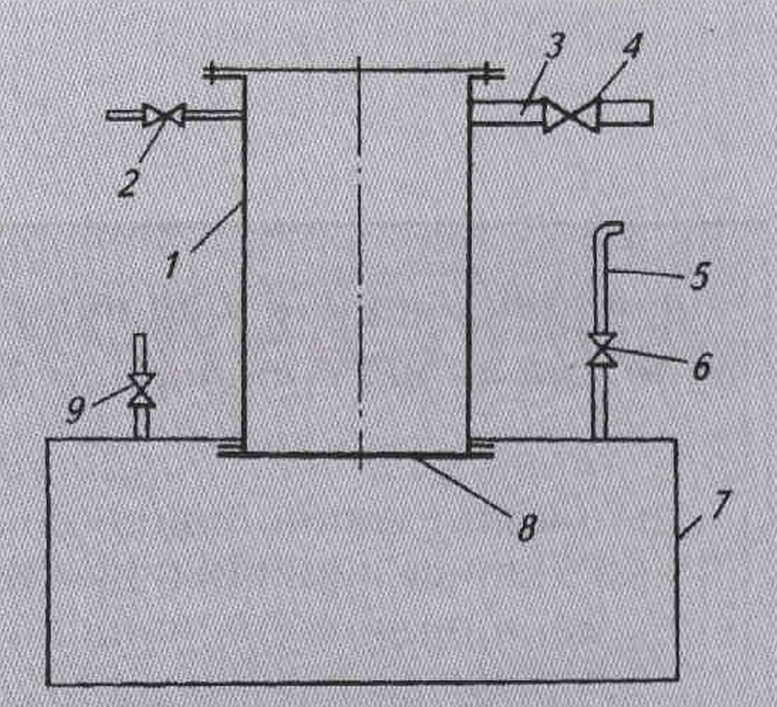 Рис. 2. Вакуумный льдогенератор:1 — цилиндрический корпус льдогенератора;2,6 — вентили-натекатели;3 — патрубок откачки паров;4 — шпорный вентиль на линии откачки паров; 5 — патрубок на линии вентиля-натекателя; 7 - сборник льда;8 — вакуумный затвор; 9 — вентиль на линии откачки паров из сборника