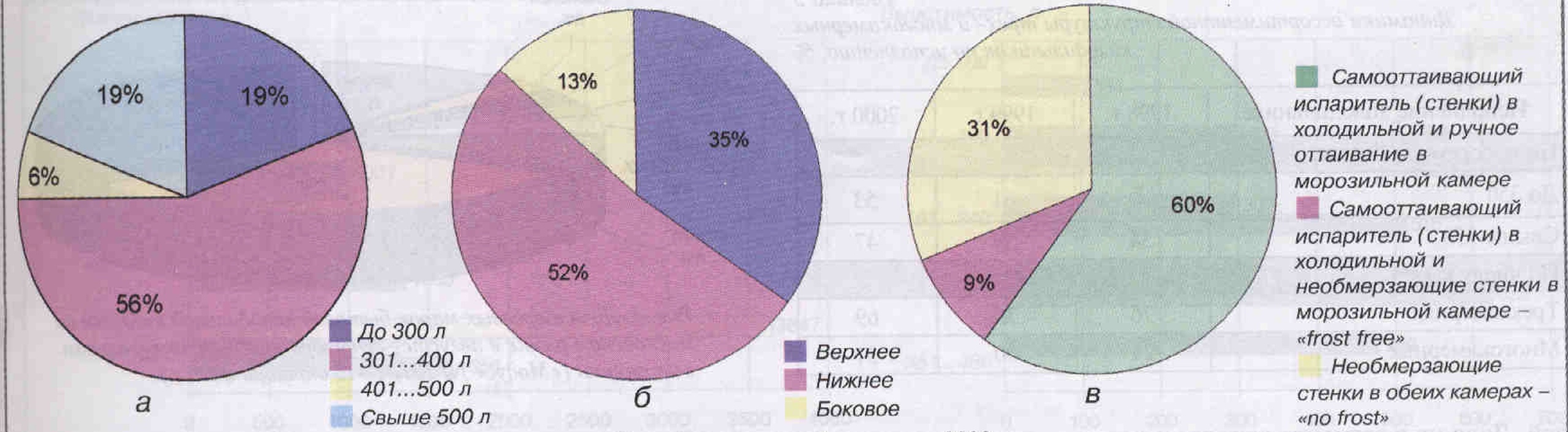 Рис.3. Ассортиментная структура двухкамерных холодильников в 2000 г. : а — по вместимости; б — по расположению морозильной камеры; в — по способу оттайки