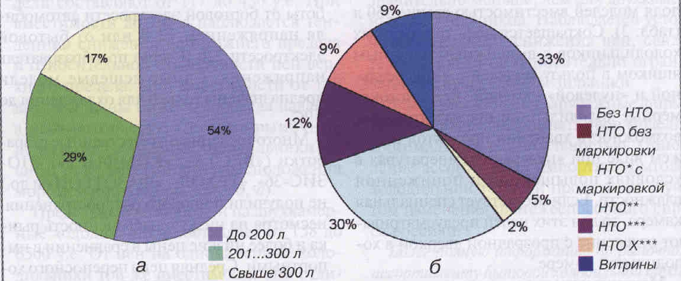 Рис.4. Ассортиментная структура однокамерных холодильников в 2000 г.: а - по вместимости; б - по возможности хранения замороженных продуктов