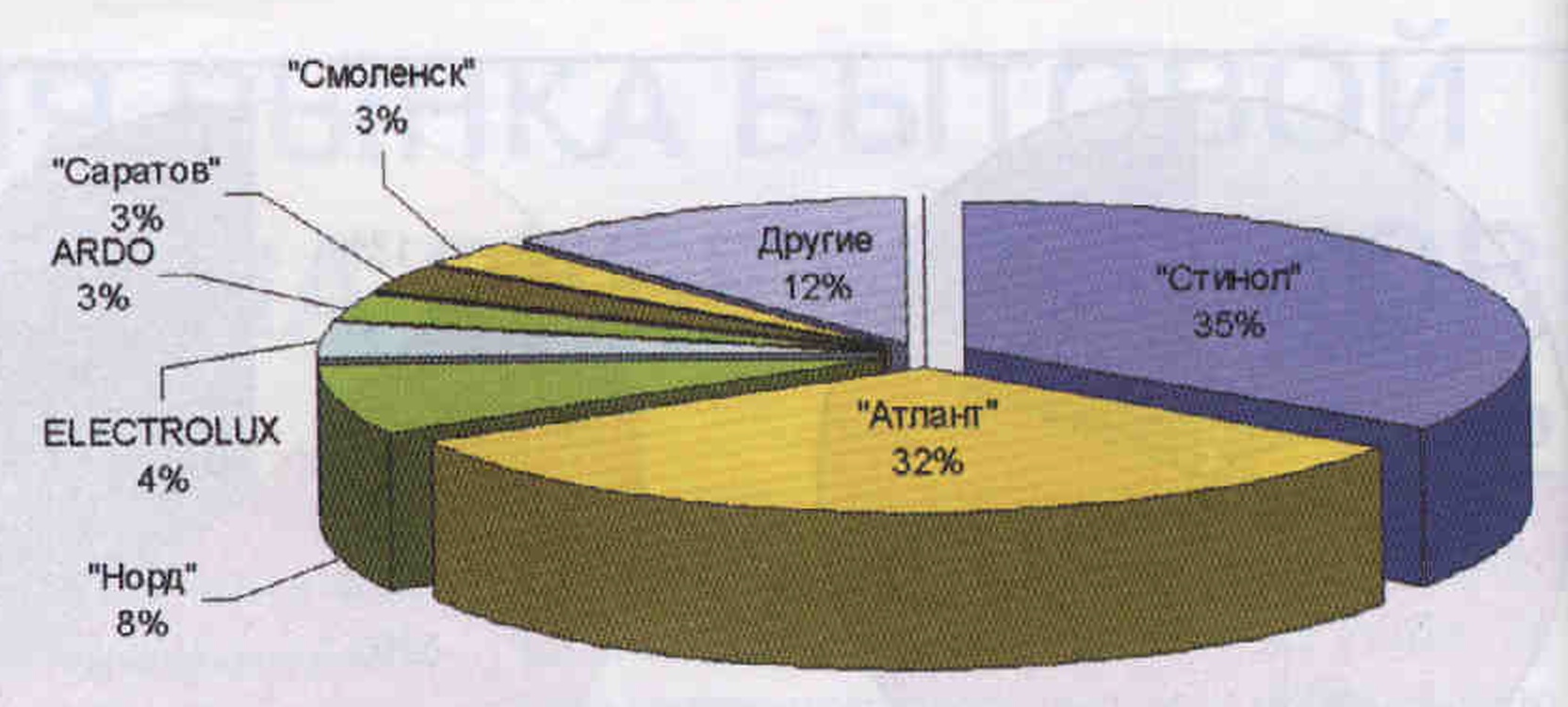 Количество отечественных моделей вместе с «Атлантами» в общей рыночной номенклатуре бытовой холодильной техники составляет около 10 %. Доля их в объемах продаж в натуральном выражении превышает 80 % (рис. 5). Увеличению ассортимента и объемов продаж отечественных холодильников способствовали не только более благоприятные условия по ценообразованию, но и вынужденный отказ покупателей от более дорогого импорта из-за падения их платежеспособности. Это привело к заметному возрождению производства на российских заводах, входящих в Ассоциацию «Холод-быт».