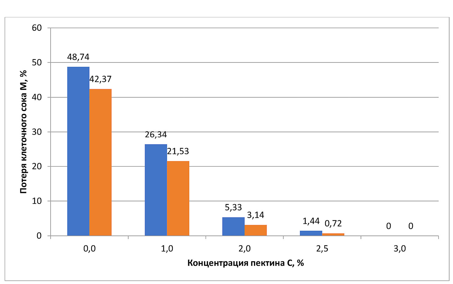 Потери клеточного сока при размораживании контрольных образцов полуфабрикатов из цикория салатного сортов Эльвира, Кружево и Корнетто К-56 составили, %: 43,64±0,70; 39,47±0,29 и 41,36±0,21 соответственно (рисунок). Добавление в гомогенную массу салатного цикория при приготовлении полуфабрикатов в качестве структурообразователя пектина (высокомолекулярного соединения, состоящего в основном из остатков галактуроновой кислоты, связанных α-1-4-гликозидной связью), позволяет существенно снизить потери клеточного сока в процессе размораживания (см. рисунок).