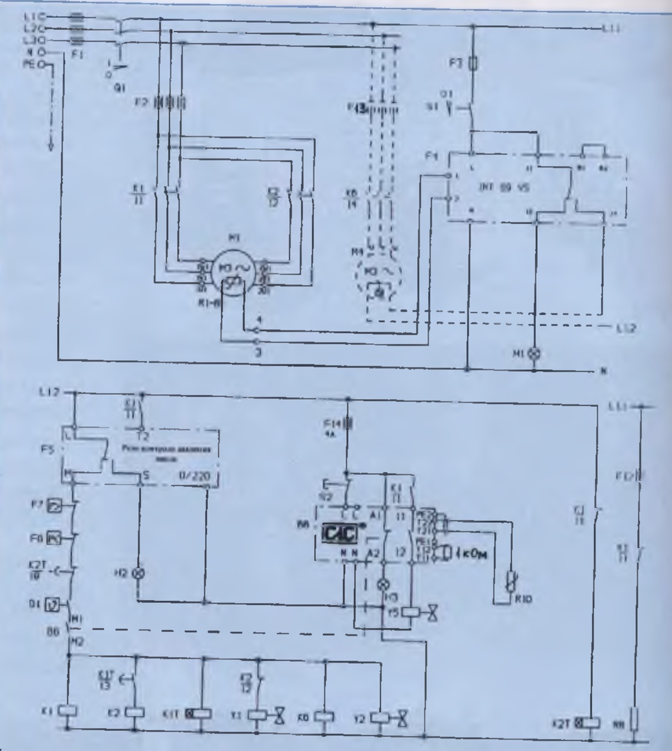 Принципиалъная электрическая схема электрооборудования одноступенчатого поршневого компрессора, оснащенного системой CIC: контакты задающего термостата RI (температура в охлаждаемом объеме). Вб - блок управления системы CIC; Н - основной предохранитель; F2 - предохранитель двигателя F3 - предохранитель цепей управления; F4 — прибор тепловой защиты двигателя,' F5 — реле контроля давления масла; F6 — реле низкого давления; 17 реле высокого давления, 2 предохранитель картерного нагревателя; F13 предохранитель двигателя • столпите, много вентилятора; F14 — предохранитель блока управления системы С1С рассчитанный на номинальную силу тока 4А; — сигнальная лампа «Авария двигателя»: Н2 сигнальная лампа * Низкое давление масла*; НЗ — сигнальная лампа «Авария С1С»: К - контактор первой части обмотки с раздельным пуском; К 2 — контактор второй части otiMumKut раздельным куском Кб контактор дополнительного вентилятора; КТ — реле времени (задержка 0.5... 1,0с) для подключения второй части обмотки с раздельным пуском; К2Т — реле времени (задержка 300 с) для защиты компрессора от циклирования; М — компрессор; N тип IHHMII вентилятор; Q1 - главный рубильник; 51 —кнопка ручного включения прибора 1NГ 69 15, 52 — ручного включения системы CIC; R 1-6 — встроенные датчики температуры обмотки двигателя компрессора: R8 картерный нагреватель; R10 - датчик температуры нагнетания; Y1 - электромагнитный клапан "Пуск без нагрузки"; Y2 - электромагнитный клапан па жидкостной магистрали; Y5 — электромагнитный клапан впрыска жидкого хладагента