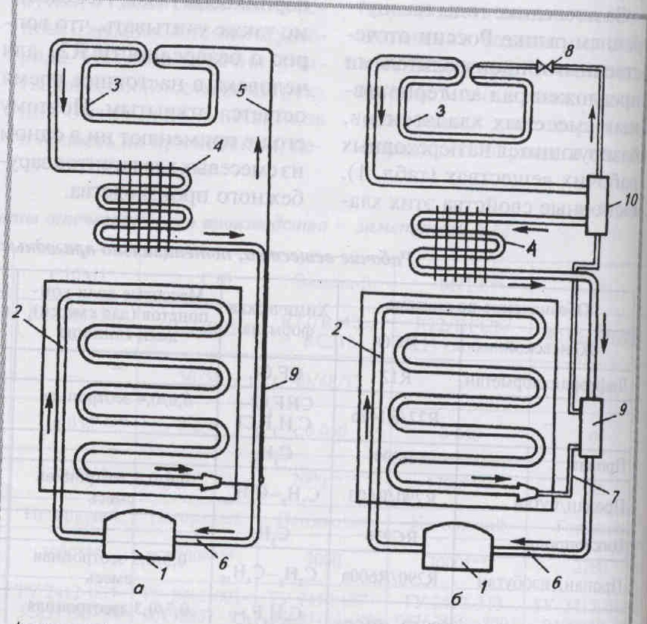 2. Household refrigerator units operating on cycles 1T2 (a) and T5 (b): 1 - compressor; 2 - capacitor; 3 - evaporator of the freezing chamber; 4 - evaporator of the refrigerating chamber; 5 - capillary tube; 6 - suction pipeline; 7 - liquid refrigerant pipeline; 8 - throttle valve; 9 regenerative heat exchanger; 10 - additional heat exchanger