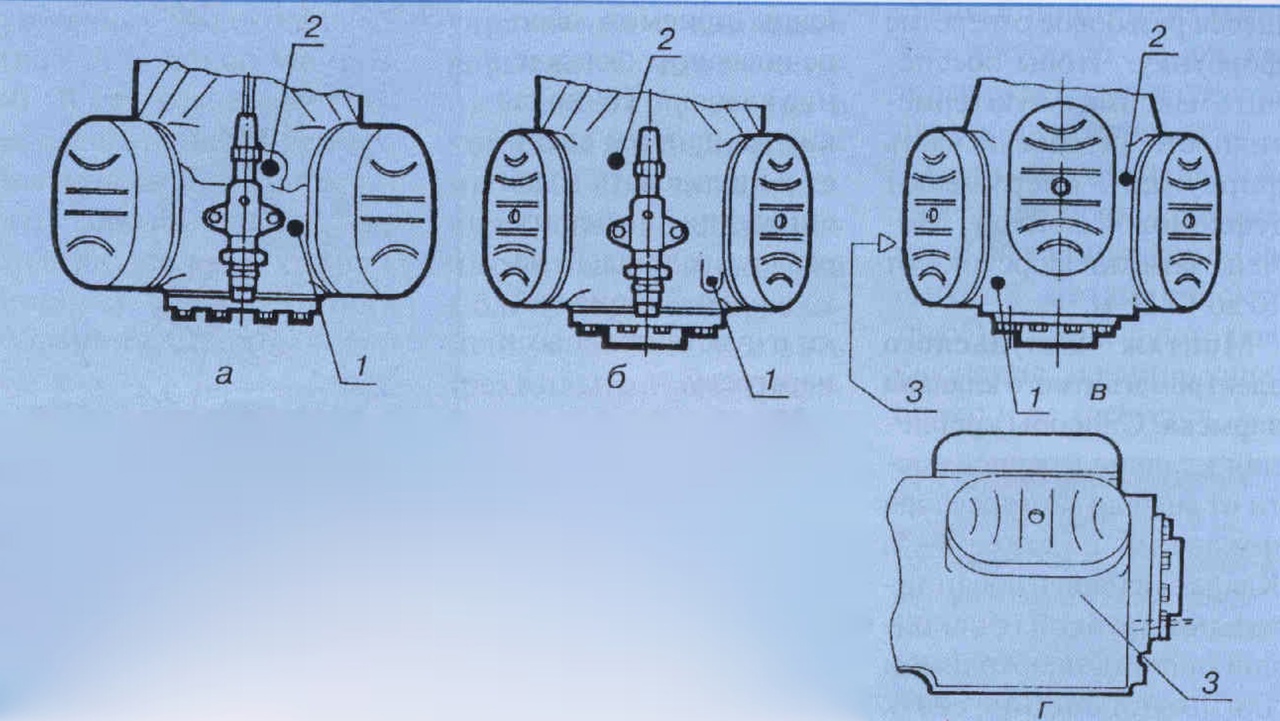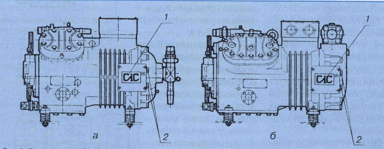 Рис. 2. Места крепления датчика температуры и форсунки (форсунок) впрыска для компрессоров: а — четырехцилиндровых моделей от 47-5.2 до 4N -12.2: 1 — отверстие для датчика температуры; 2 — отверстие для форсунки; б — четырехцилиндровых моделей от 4Z-13.2 до 4G-20.2: 1 — отверстие для датчика температуры; 2 — отверстие для форсунки; в — для шестицилиндровых с отверстием для форсунки размером 1,65" (поз. 2) и размером 1,2" (поз. 3); г — вид сбоку (со стороны, противоположной смотровому стеклу) на компрессор, показанный на рис. 2, в