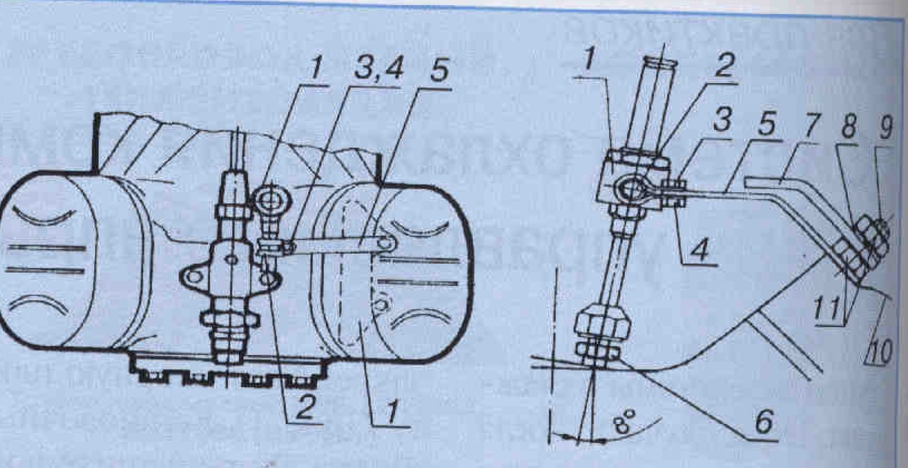 Рис. 3. Положение импульсного электромагнитного клапана впрыска при установке на четырехцилиндровых компрессорах моделей от 4Z-52 до 4N -12.2 (катушка клапана условно не показана): 1- клапан впрыска: 2 — зажимной хомут; 3 — болт М6х12; 4 - гайка Мб; 5 — крепежный угольник; 6 — форсунка; 7 — лапа для крепления дополнительного вентилятора; 8 — пружинная шайба; 9 — шпилька; 10 — головка блока цилиндров; 11- гайка М 10
