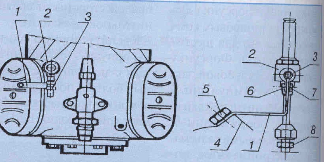 Рис. 4. Положение импульсного электромагнитного клапана впрыска при установке на четырехцилиндровых компрессорах моделей от 47-13.2 до 4G- 20.2 (катушка клапана условно не показана): 1 — крепежный угольник; 2 — клапан впрыска; 3 - зажимной хомут; 4 - головка блока цилиндров; 5 - болт головки блока цилиндров; 6 — болт М6х12; 7 — гайка Мб; 8 — форсунка