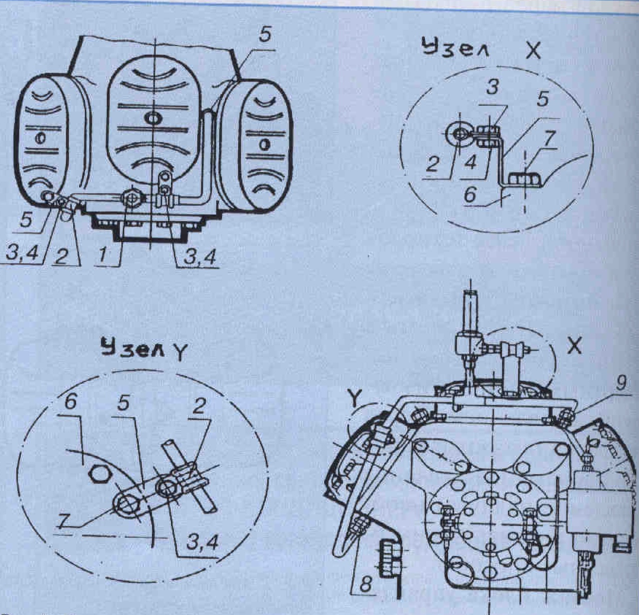 В моделях от 4Z-5.2 до IN-12.2 (см. рис. 3) крепежный угольник 5 устанавливают одновременно с лапой 7 крепления дополнительного вентилятора этого вначале отвинчивают один из шестигранных болтов головки крюка цилиндров и на его место ввинчивают до упора в шпильку 9, входящую в комплект поставки дополнительного вентилятора.