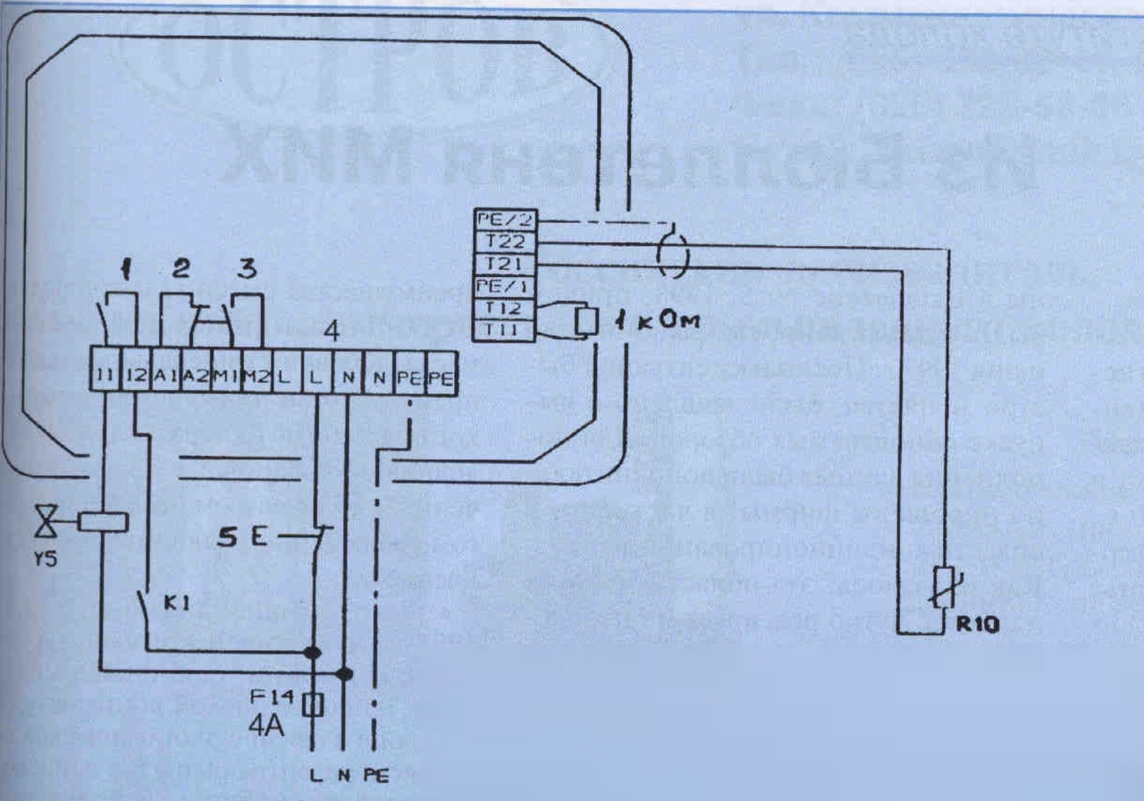 Puc. 6. Схема подключения элементов системы С1С к блоку управления; 1 — контакт клапана впрыска; 2 — контакт аварийной сигнализации; 3 — контакт предохранительной цепи; 4 - клеммы подключения электропитания; 5 — ручное включение системы С1С; А1/А2 аварийная сигнализация (напряжение на клеммах отсутствует); М 1 / М2 — цепь управления контактором компрессора (напряжение на клеммах отсутствует); L /N — напряжение электропитания; РЕ — клеммы для подключения заземления; РЕ/ 1)Ч:/2 - клеммы для подключения экранирующей оплетки кабеля датчика температуры; R 10 - датчик темпера туры. К5 клапан впрыска (нормально закрытый); К1 — контактор компрессора; F14 — предохранитель блока управления системы С1С, рассчитанный на номинальную силу тока 4А