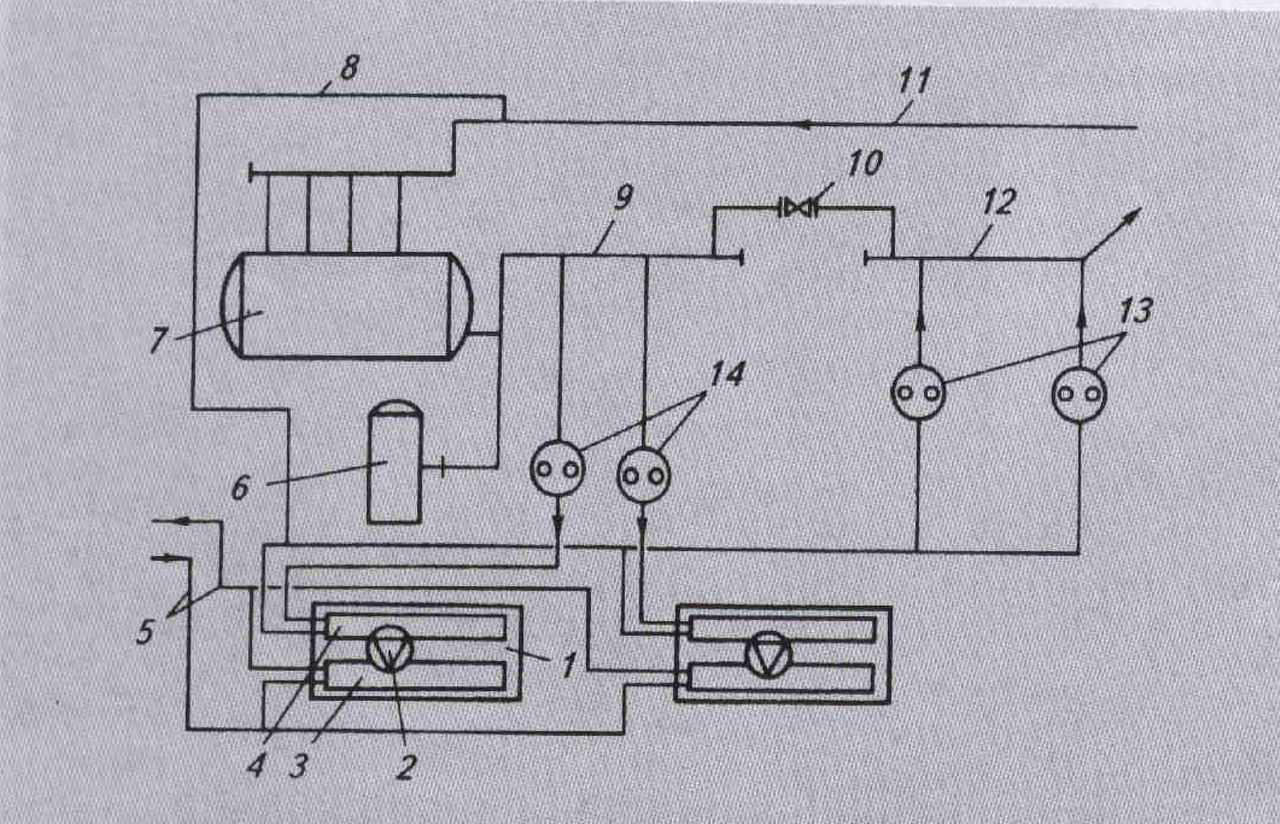 Рис. 2. Принципиальная схема центральной системы холодоснабжения: 1 — холодильная машина; 2 — двухступенчатый турбокомпрессор; 3 — конденсатор; 4 — испаритель; 5 — трубопроводы оборотного водоснабжения; 6 — мембранный расширительный бак для воды: 7 — сборный герметичный бак; 8 - отводной трубопровод; 9 — общий обратный коллектор; 10 — регулятор перепада давлений охлажденной воды; 11 — общий обратный трубопровод; 12— подающий коллектор; 13, 14 циркуляционные сдвоенные насосы