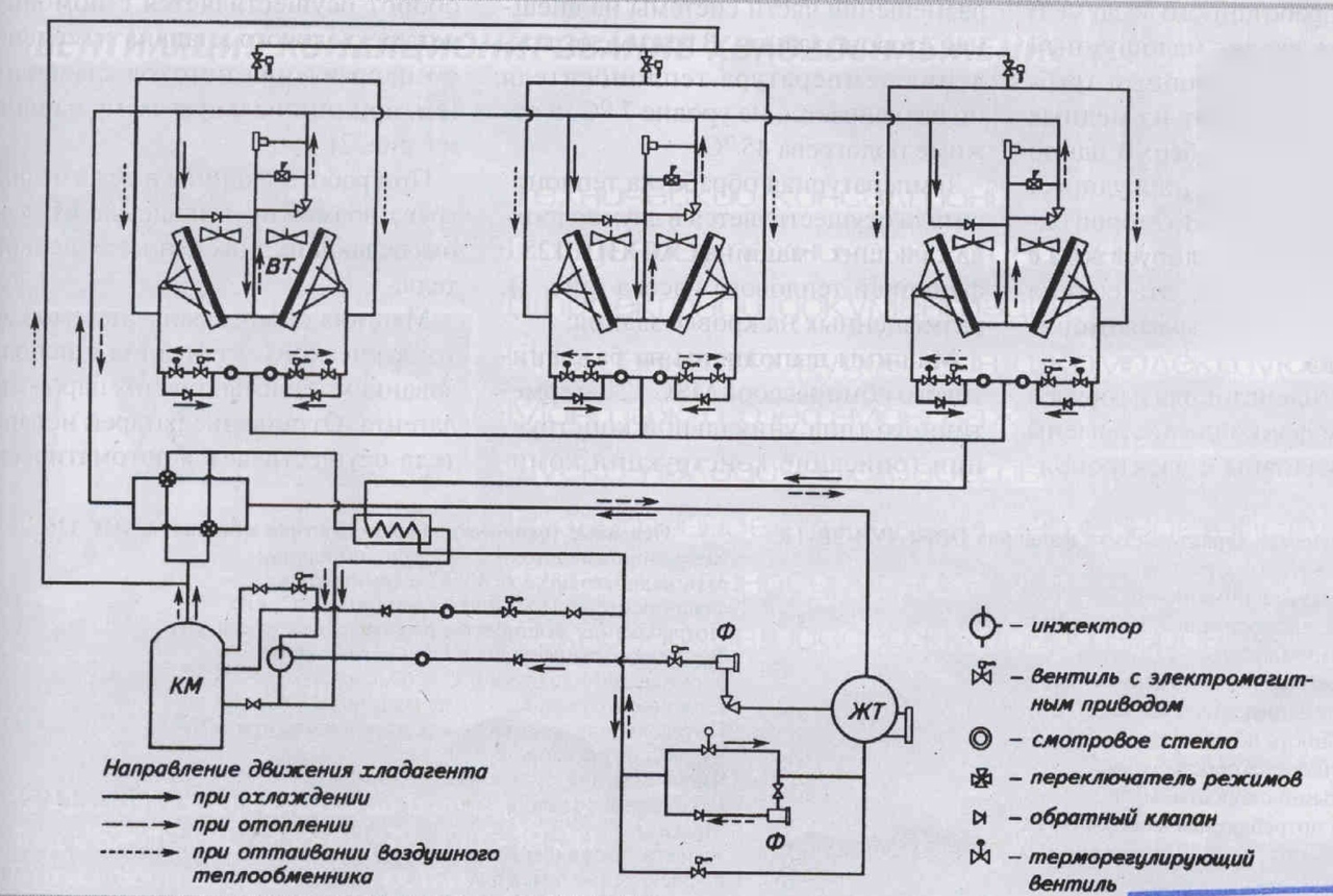 Переключение машины с режима охлаждения на режим подогрева и наоборот осуществляется с помощью четырехходового клапана изменением направления потоков хладагента (см. принципиальную схему машины на рис. 2).