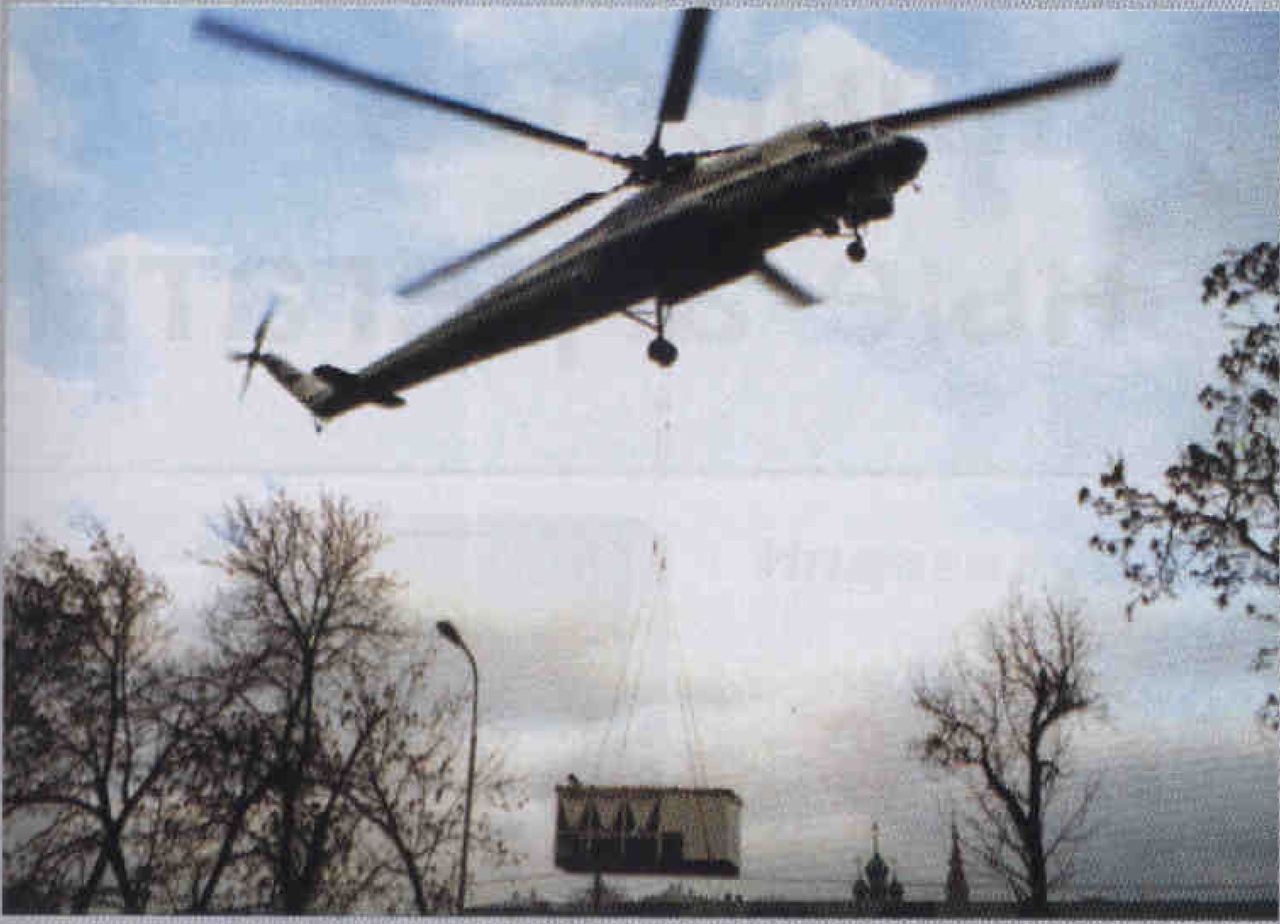 Определенные трудности представили доставка столь крупного холодильного оборудования и монтаж его на месте эксплуатации на узкой улице в центре Москвы. Ширина Б.Черкасского переулка не позволила использовать стандартные транспортные средства. Монтаж оборудования был выполнен с помощью вертолетной авиации. Один из рабочих моментов этой операции показан на рис. 3.