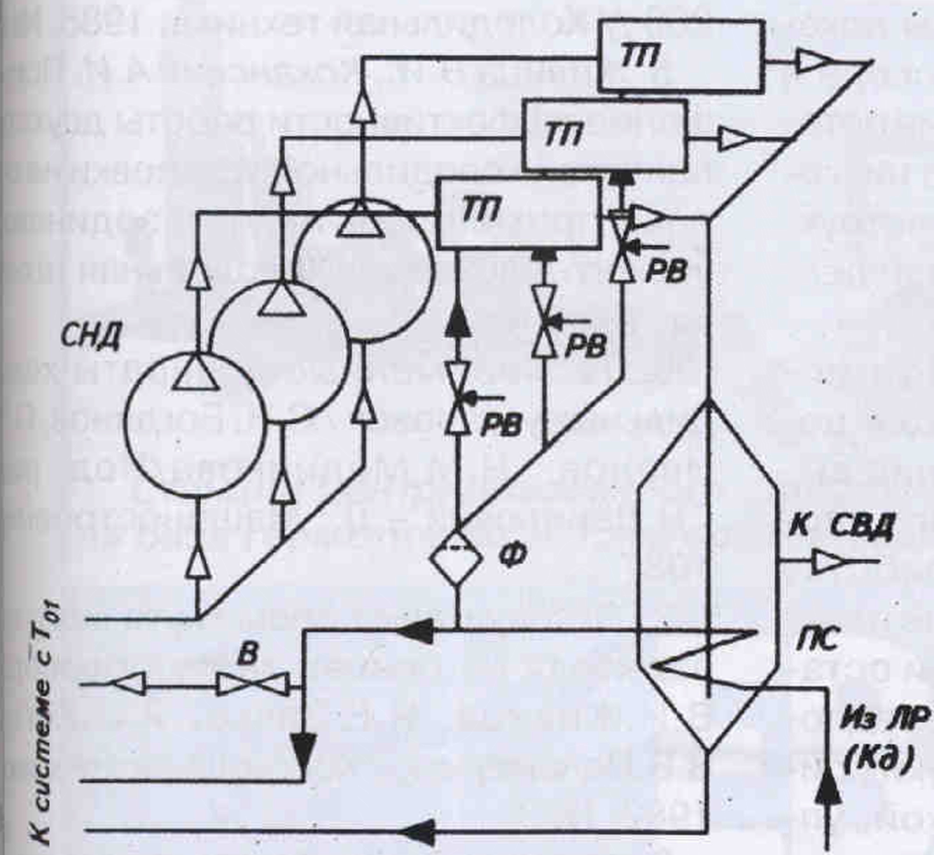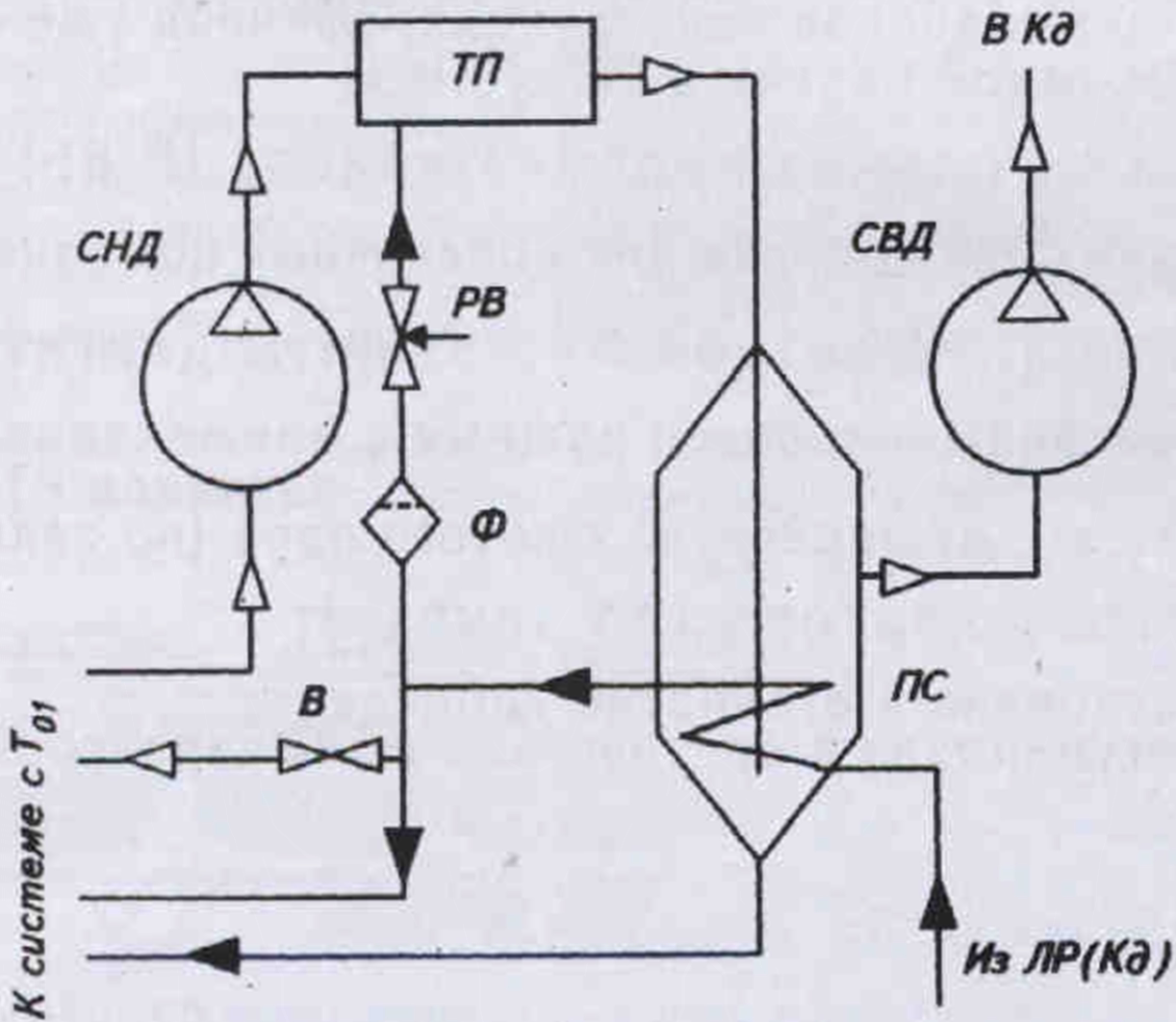 Puс. 1. Упрощенная схема узла промежуточного охлаждения с применением термопрессора для отдельного двухступенчатого агрегата: СПД — ступень низкого давления; СВД — ступень высокого давления; ТП — термопрессор; Ф — фильтр; ПС — промсосуд; В — вентиль продувки форсунки; ЛР — линейный ресивер, Кд — конденсатор; Т01 — температура кипения, обеспечиваемая агрегатом