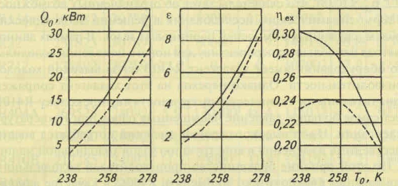 Как показывает сравнение энергетических характеристик теоретического и действительного компрессоров, работающих на R22, значения их холодопроизводительности Qo, холодильною коэффициента е и особенно эксергегического КПД сильно различаются (рис. 2). По этому необходимо относиться с достаточной осторожностью к рекомендациям по выбору хладагентов, основанному только на теоретическом анализе циклов без учета корректно определенных значений коэффициента подачи и коэффициента полезного действия компрессора.