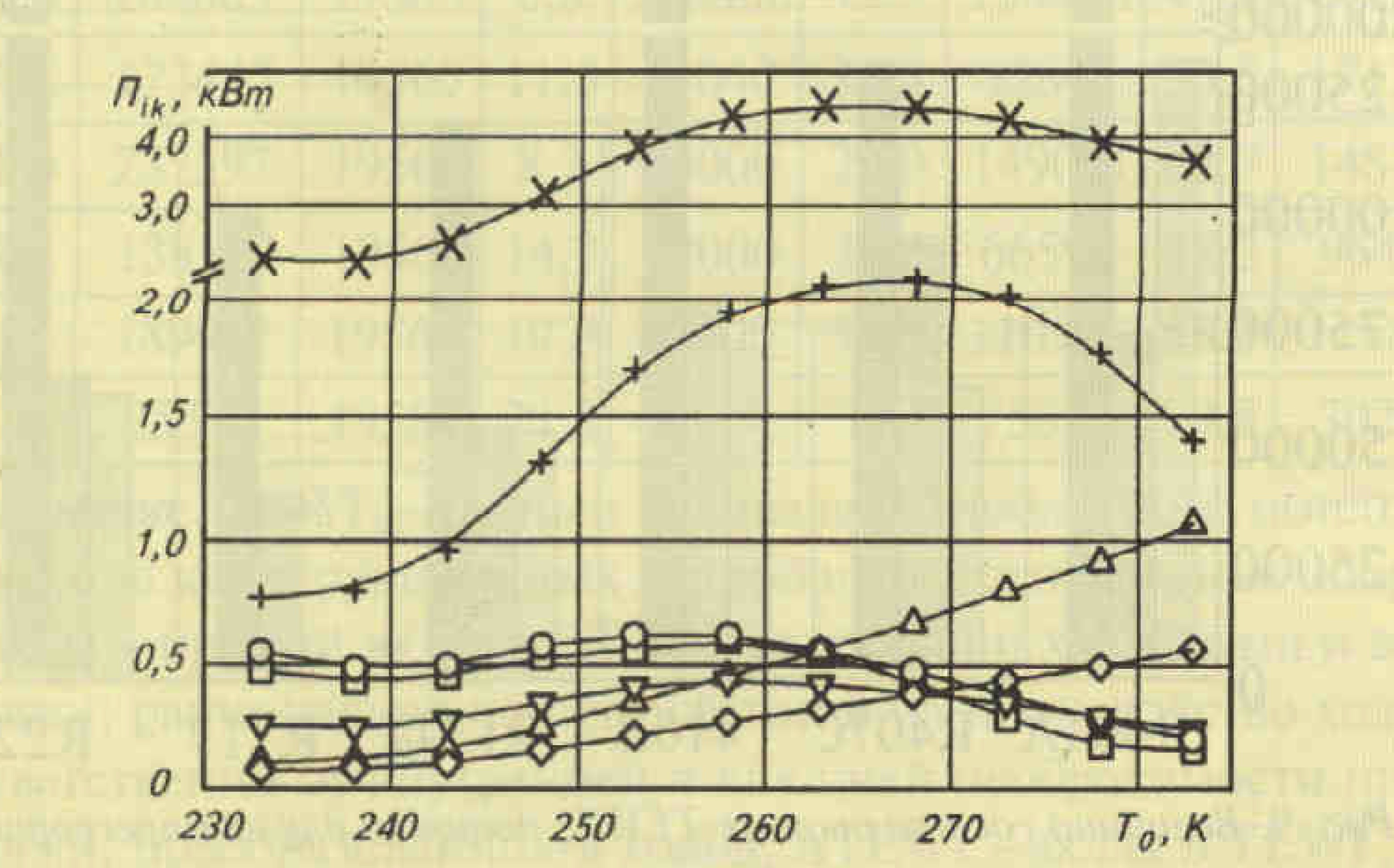 Результаты расчета эксергетических потерь для компрессорной системы, работающей на хладагенте R22 при различных температурах кипения, приведены на рис. 3. Сложный характер зависимостей k = f ( Т ) обусловлен противоречивым влиянием на абсолютную величину потерь двух факторов: во-первых, увеличением необратимости процессов. протекающих в компрессорной системе; во-вторых, уменьшением массового расхода хладагента, циркулирующего по контуру системы. Максимальные эксергетические потери 1/7наблюдаются в интервале температур 258 < То < 268 К. Зависимость холодопроизводисльности, эксергегического КПД и подводимой эксергии для компрессора, работающего на R22, от Т1 показана на рис. 4, из которого следует, что имеет экстремум.