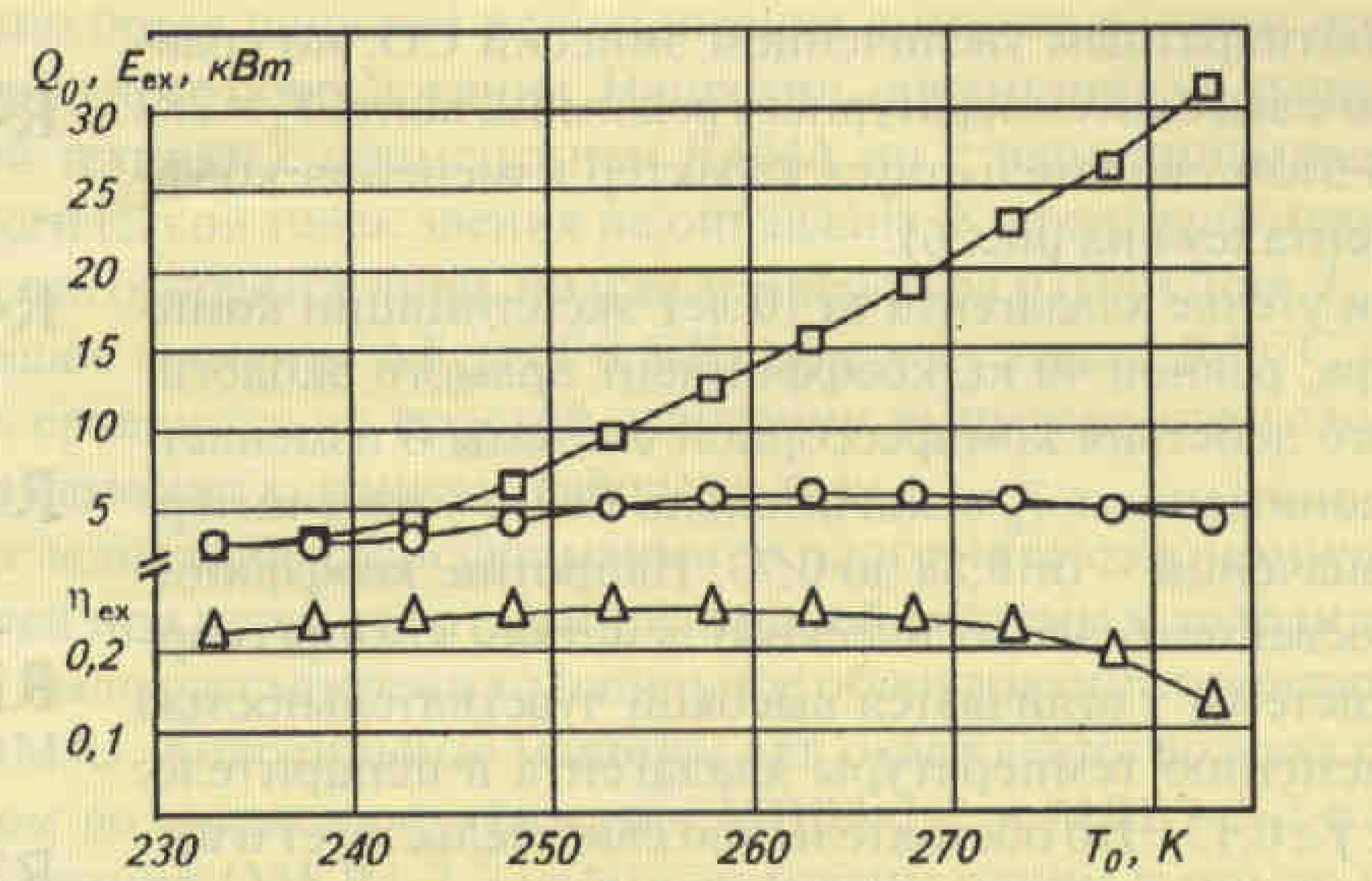5. Rice. Fig. 4. Dependence of energy characteristics on the boiling point in the compressor system when operating on R22: □ - cooling capacity Qo; o - exergy Ea; A - exergy efficiency
