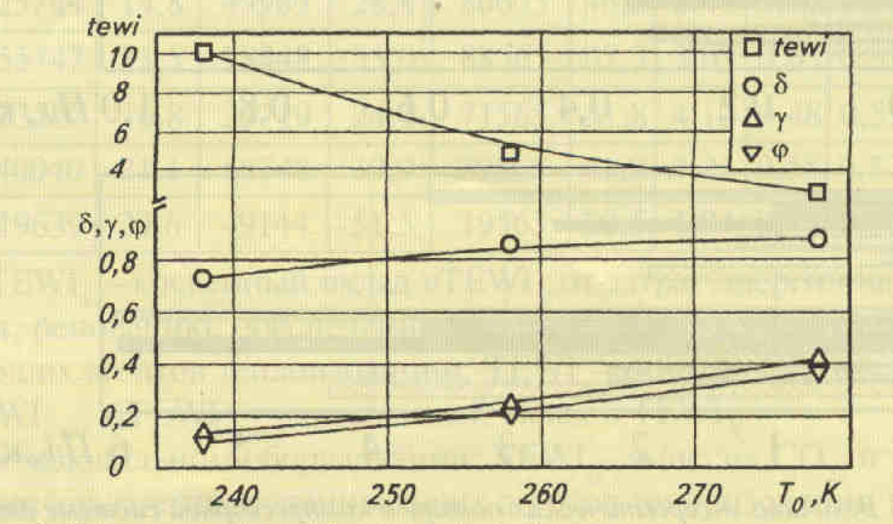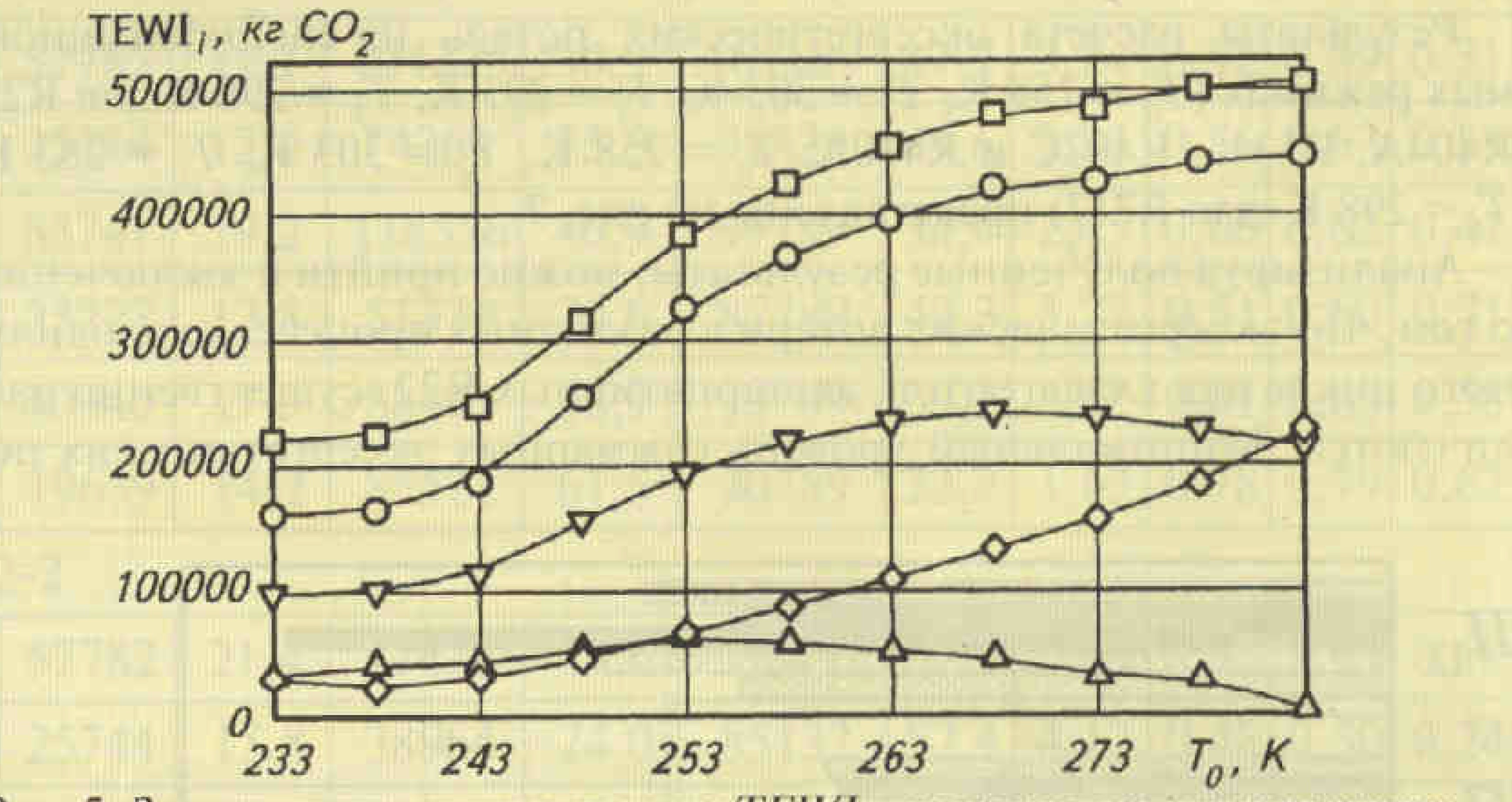 Рис. 5. Зависимость составляющих TEWI* потоков от температуры кипения для компрессорной системы при работе на R22: □ — TEWI*, полный эквивалент глобального потепления; о TEWip, эмиссия СО, от рационально использованной на производство холода энергии; Д - Д TEWi , косвенный вклад в TEWiN от внутренней необратимости процессов в холодильном цикле; V — ATEW, косвенный вклад в TEWI v от внешней необратимости процессов в холодильном цикле; 0 - TEWQ, эмиссия СО, от части энергии, преобразованной в холод